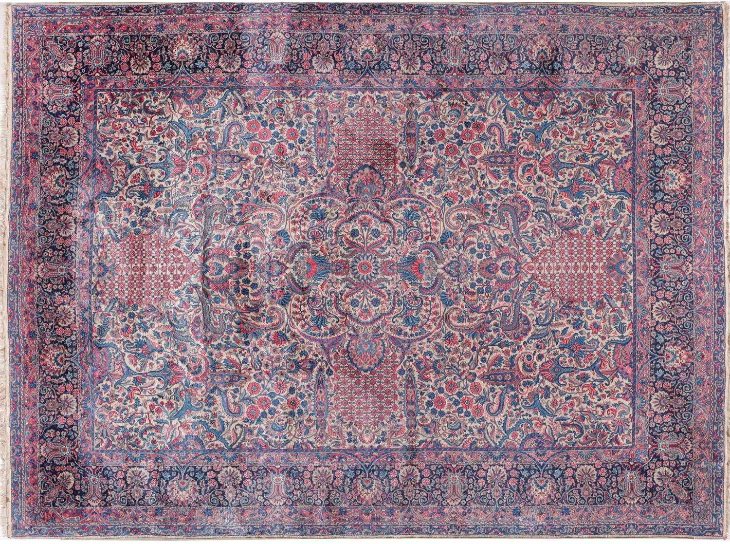 Großer alter Kirman-Teppich Persien. Um 1930. Wolle auf Baumwolle. Feine Knüpfung. Im elfenbeinfarbenen Innenfeld großes, offen gestaltetes Zentralmedaillon sowie große Reserven aus Rosetten im Rapport. Flächendeckende Musterung aus dichten Blütenranken. Umlaufend breite dunkelgrundige Palmettenbordüre, flankiert von schmalen Nebenbordüren. 368 cm x 270 cm.