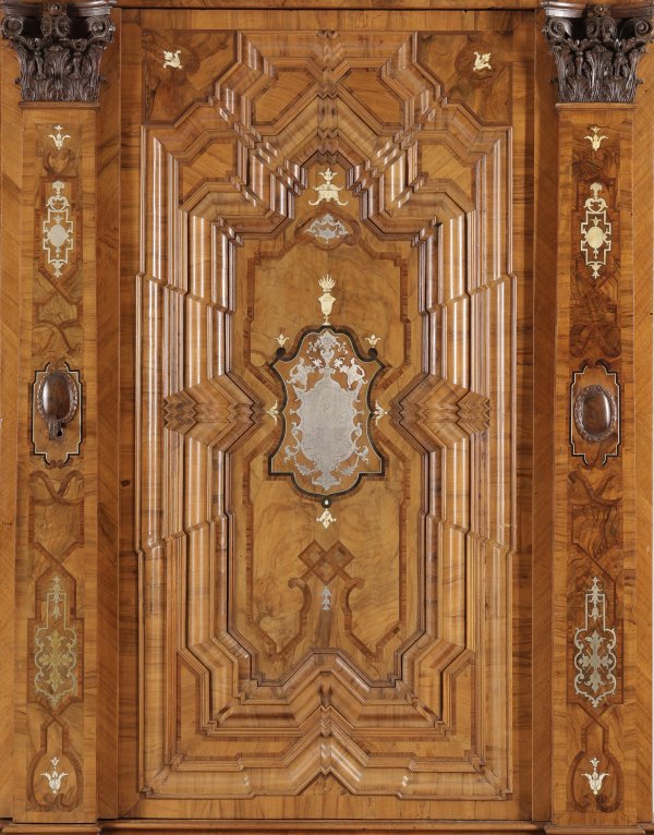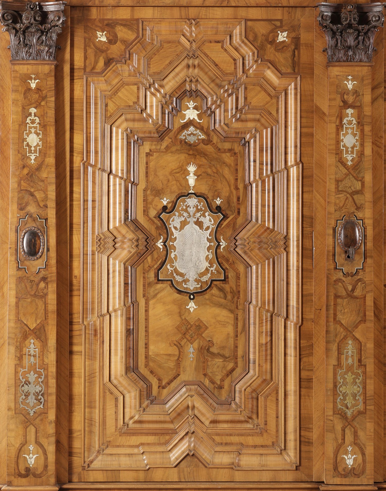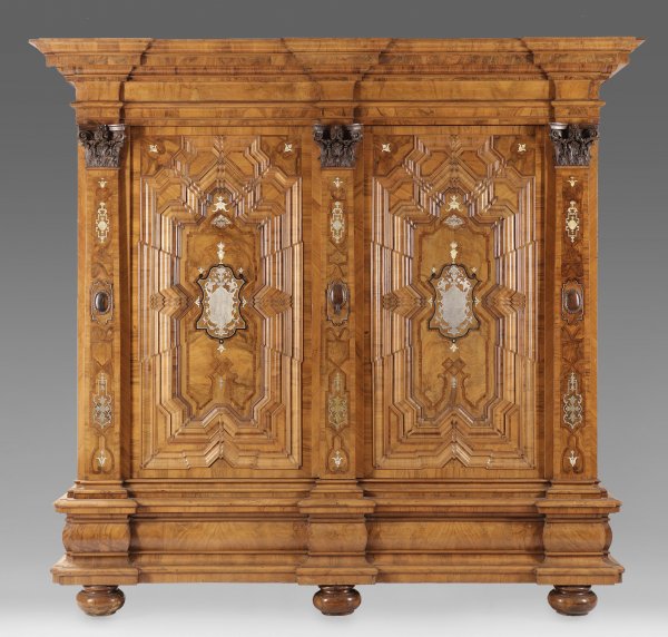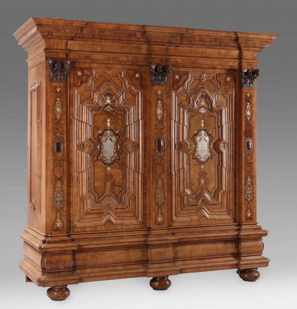 Großer Braunschweiger Barock-Dielenschrank Nussbaum und Nussbaummaser, furniert sowie Einlagen aus fein radiertem Zinn und Elfenbein. Gerader, hochrechteckiger Korpus auf breitem, leicht gewulstetem, tief gekehltem Zargensockel sowie gedrückten Kugelfüßen. Große Bastionfüllungen mit aufgedoppelten und kompliziert verkröpften Bossen. In der gegliederten Front zwei große Türen mit entsprechend aufwändig profilierten Füllungen, flankiert von breiten Pilastern mit reliefplastisch geschnitzten korinthischen Kapitellen sowie zentralen Medaillons. In der Mitte jeweils passig geschweifte Reserve sowie große, szenisch gestaltete Zinneinlage mit den Darstellungen der Heiligen Familie, Engeln, dem Jesuknaben, den jungen Johannes zeigend bzw. Christus erscheint den Jüngern und Moses mit den Gesetzestafeln. Flächendeckende Furnierfelder, von aufwändig verschlungenem Bandelwerk begrenzt. Dekorationen aus großen, eingelegten Kelchblüten sowie Kartuschenmotiven mit Blattwerk. Weit vorkragendes, verkröpftes Profilgesims. H. 252 cm. 267 cm x 93 cm.