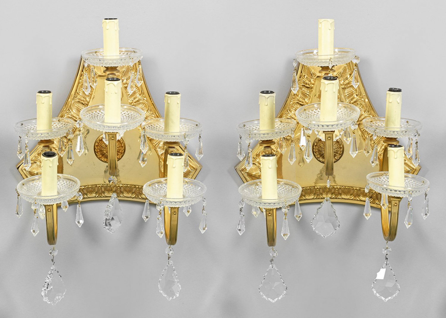 Paar dekorative Wandlampen 6-flg.; Messing sowie farbloses Kristallglas. Flaches, konkav eingezogenes Wandschild mit umlaufendem Palmettenfries als Träger für paarweise, gestuft angeordnete Leuchterarme mit zylinderförmigen Tüllen. Prismenbehang. Elektrifiziert. H. 52 cm.