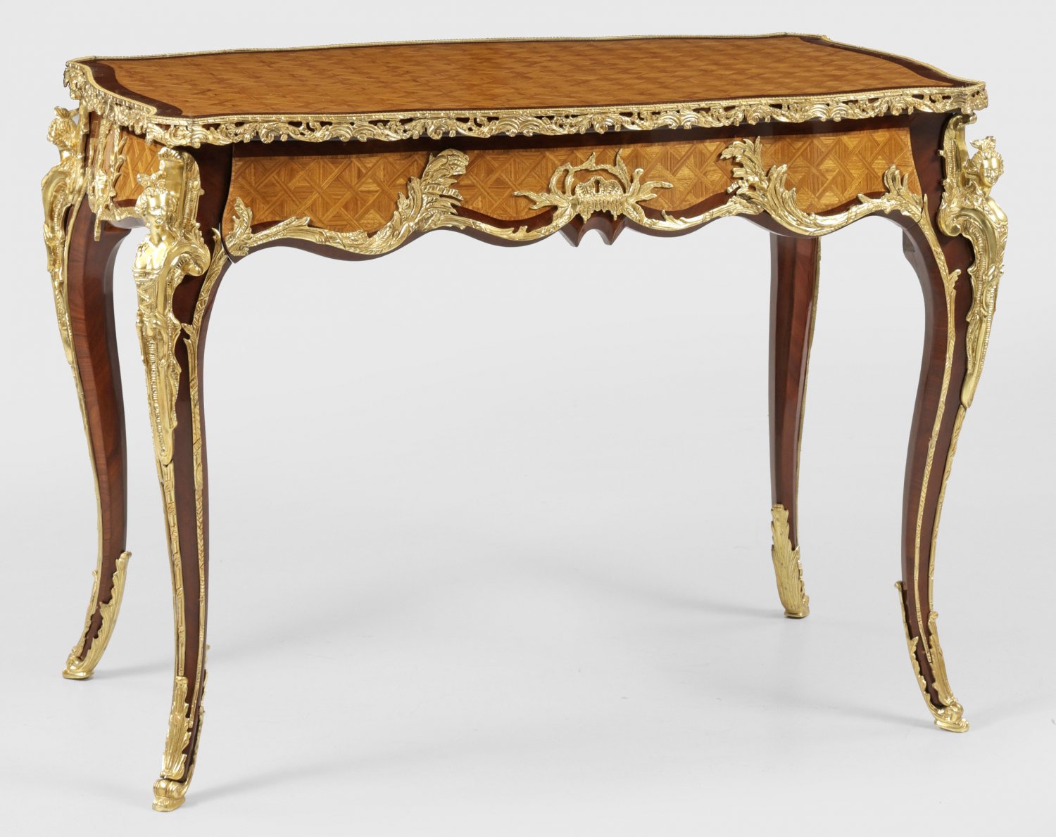 Prachtvolles Bureau plat im Louis XV-Stil Mahagoni und Rosenholz, furniert. Leicht bombierte, passig geschweifte Zarge auf hohen, geschwungenen Beinen mit weiblichen Hermenfiguren. In der Front breites Schubfach. Korrespondierende, profilgerahmte Deckplatte. Allseitig gerahmte Furnierfelder aus Gitterwerk sowie reiche Applikationen aus vergoldeter Bronze. H. 82 cm. 110 cm x 69 cm.