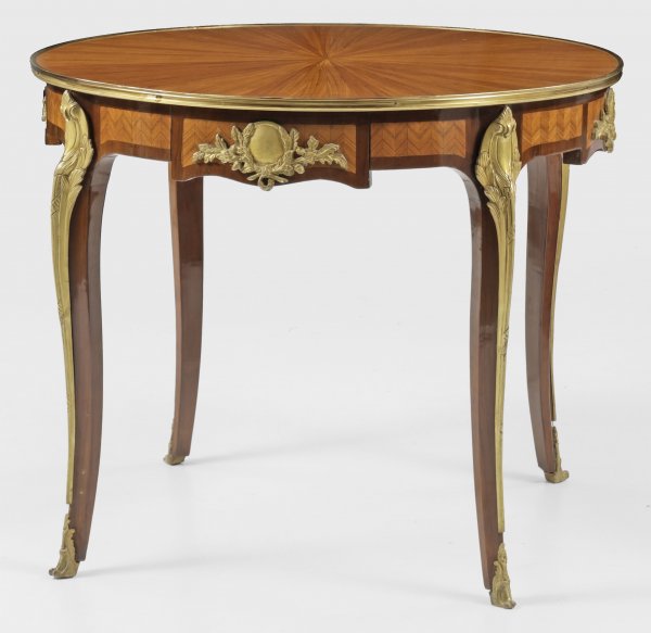 Großer Louis XV-Salontisch Palisander und Rosenholz, furniert. Bombierte Zarge mit flachen Mittelrisaliten auf leicht geschweiften, konischen Beinen als Träger für runde, profilgerahmte Deckplatte mit zentriert angeordneten Furnierfeldern. Applikationen aus Bronze. H. 80,5 cm. D. 101 cm.