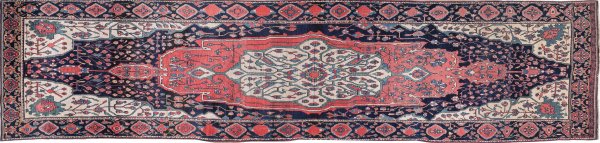 Alte Bachtiar-Galerie Persien. Mitte 20. Jh.; Wolle auf Baumwolle. Auf schwarzem Fond große, gestreckte Reserve in Rot sowie entsprechendes Medaillon und breite Ecklösungen in Cremefarbe. Flächendeckende Musterung aus stilisierten Blütenzweigen. Umlaufende Bordüre mit Rautenmotiven. 504 cm x 126 cm.