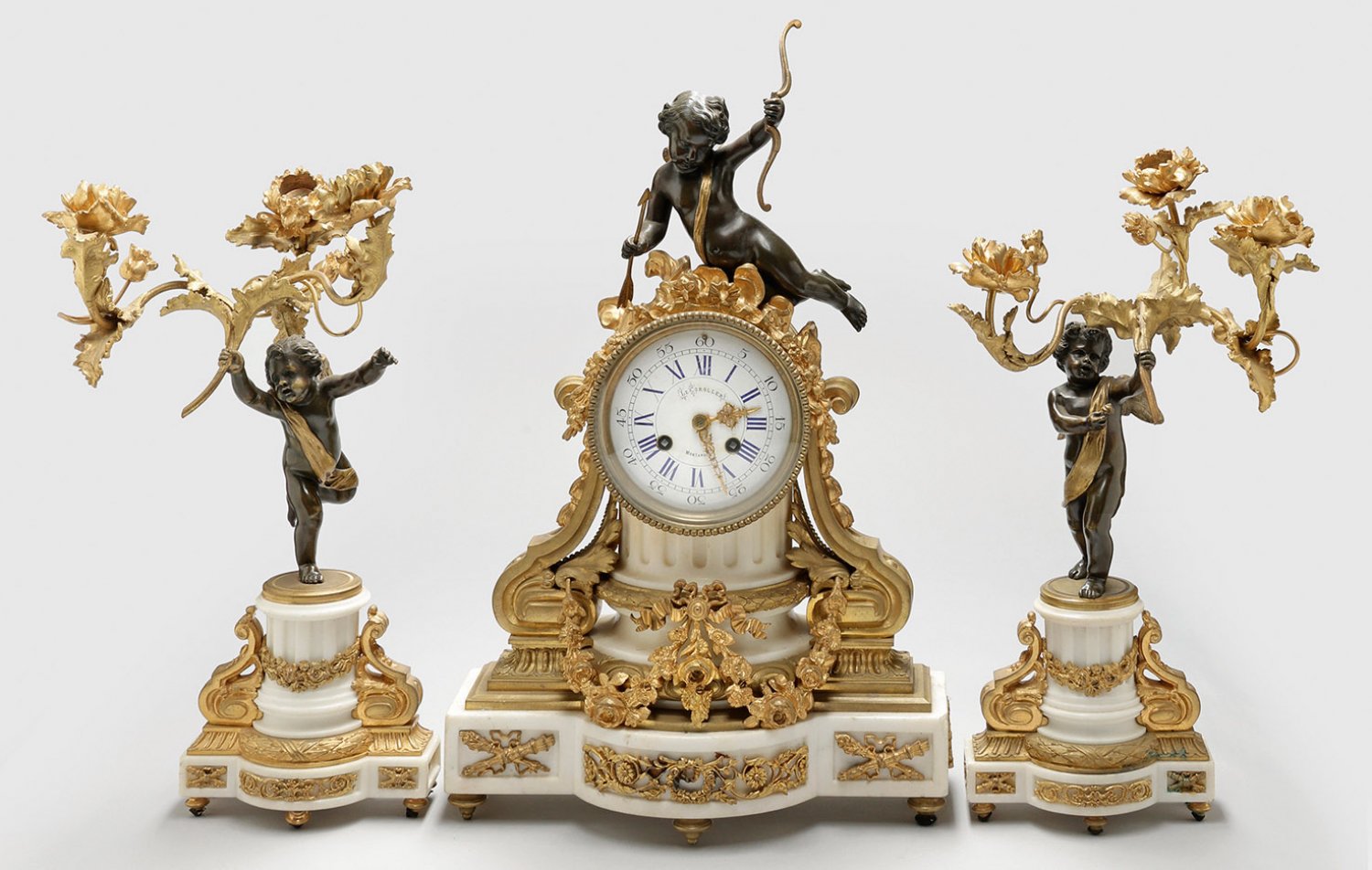 Napoleon III-Pendulengruppe 3-tlg.; Pendule und Paar Girandolen. Bronze, vergoldet sowie dunkel patiniert und weißer Marmor. Architektonisch gegliederter Korpus aus kanneliertem Säulenstumpf, flankiert von eingerollten Voluten, durch Feston verbunden. Vollplastische Bekrönung in Gestalt eines Amorknaben. Verglastes Zifferblatt bez. Le Coroller Montagis. Pendulenwerk mit Pendelfeder sowie Halbstundenschlag auf Glocke. Pendel fehlt. Korrespondierendes Paar 3-flg. Leuchter mit blütenförmigen Tüllen. Uhren-H. 50 cm. 30 cm x 13,5 cm. Leuchter-H. 41 cm.