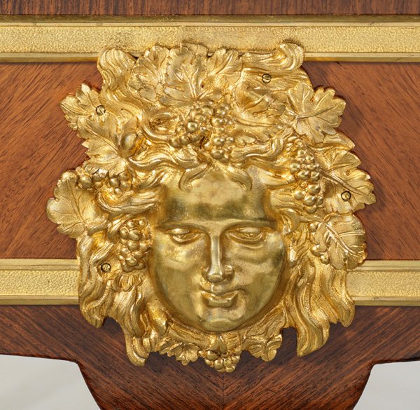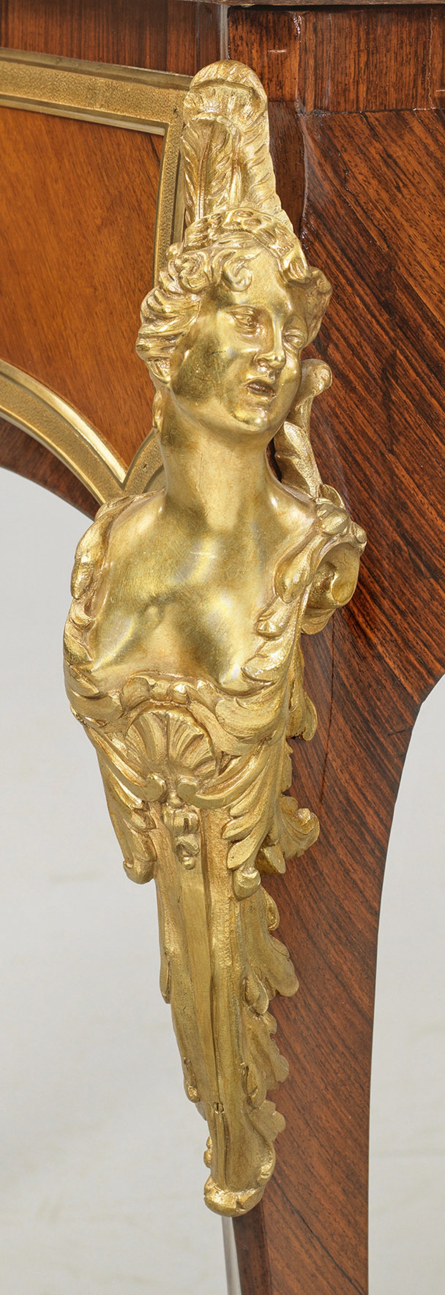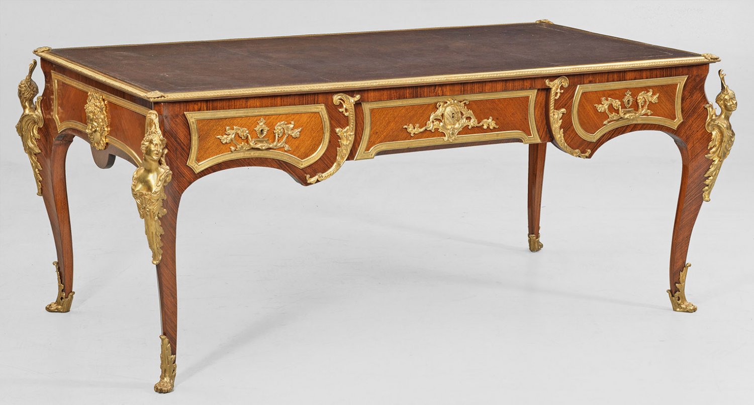 Großes repräsentatives Louis XV-Bureau plat Palisander, furniert. Passig geschweifter Korpus, flankiert von weit ausgezogenen Ecklisenen mit vollplastisch gestalteten, weiblichen Hermenfiguren, in leicht geschweifte Beine mit Tatzenfüßen übergehend. In der gegliederten Front breites Kniefach und drei Schubladen unterschiedlicher Größe sowie rückseitig entsprechende Blendschubladen. Allseitig profilgerahmte, gespiegelt angeordnete Furnierfelder, seitlich mit großen Maskarons. Gering überstehende Deckplatte mit eingelegter Arbeitsfläche aus olivbraunem Leder. H. 79 cm. 186 cm x 101 cm.