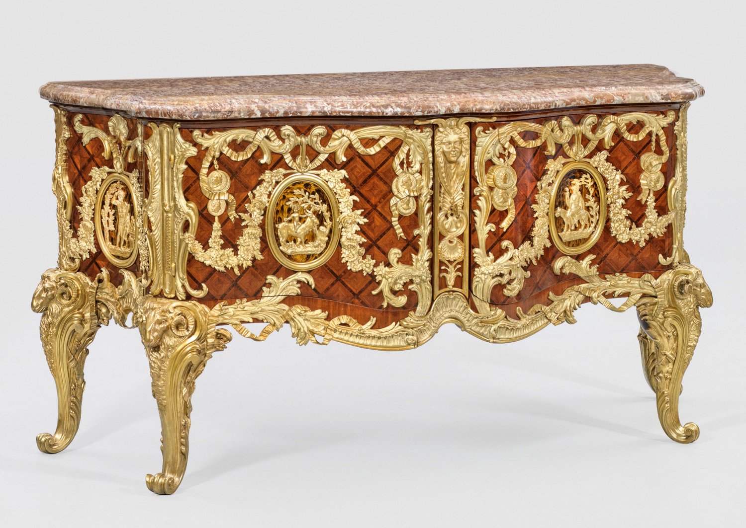 Palisander und Amaranth, furniert sowie reiche Applikationen aus vergoldeter Bronze. Dreiseitig stark geschweifter Korpus, flankiert von leicht eingezogenen Ecklisenen auf kräftigen Volutenbeinen mit großen, reliefplastisch gestalteten Widderköpfen. In der gegliederten Front zwei große Türen mit zentralem Schließmechanismus sowie dahinter jeweils zwei Schubladen. Flächendeckende Marketerie aus Gitterwerk und rautenförmigen, zentriert angelegten Furnierfeldern. Üppige, detailreich ausgeformte Applikationen in Form von Medaillons mit allegorischen Szenerien, umgeben von Blütenfestons, großzügig angelegten Rocaillen, Blattwerk, Schleifenband und reliefierten Medaillen sowie Maskarons. Korrespondierende, umlaufend profilierte rest. Deckplatte aus rotem, weiß-grau gemasertem sog. Rouge Royal Marmor. H. 93 cm. 177 cm x 71,5 cm.