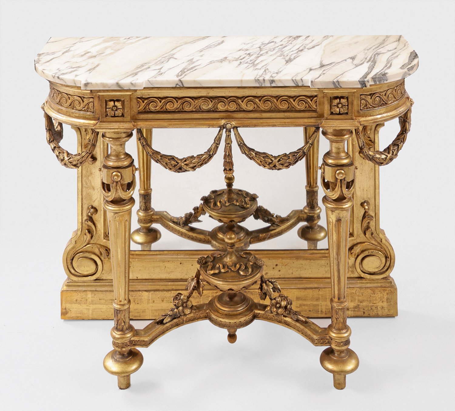Napoleon III-Konsoltisch Holz, stuckiert und goldfarben gefasst. Bombierte Profilzarge mit breitem Wellenbandfries auf kannelierten Balusterbeinen sowie verspiegelte Rückwand mit Volutenmotiven. In der Mitte gebogter Steg mit Vasenbekrönung sowie Dekorationen aus Festons. Gering überstehende Deckplatte aus weißem, cremefarben und grau gemasertem Marmor. H. 82 cm. 104,5 cm x 42 cm.