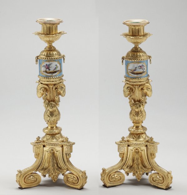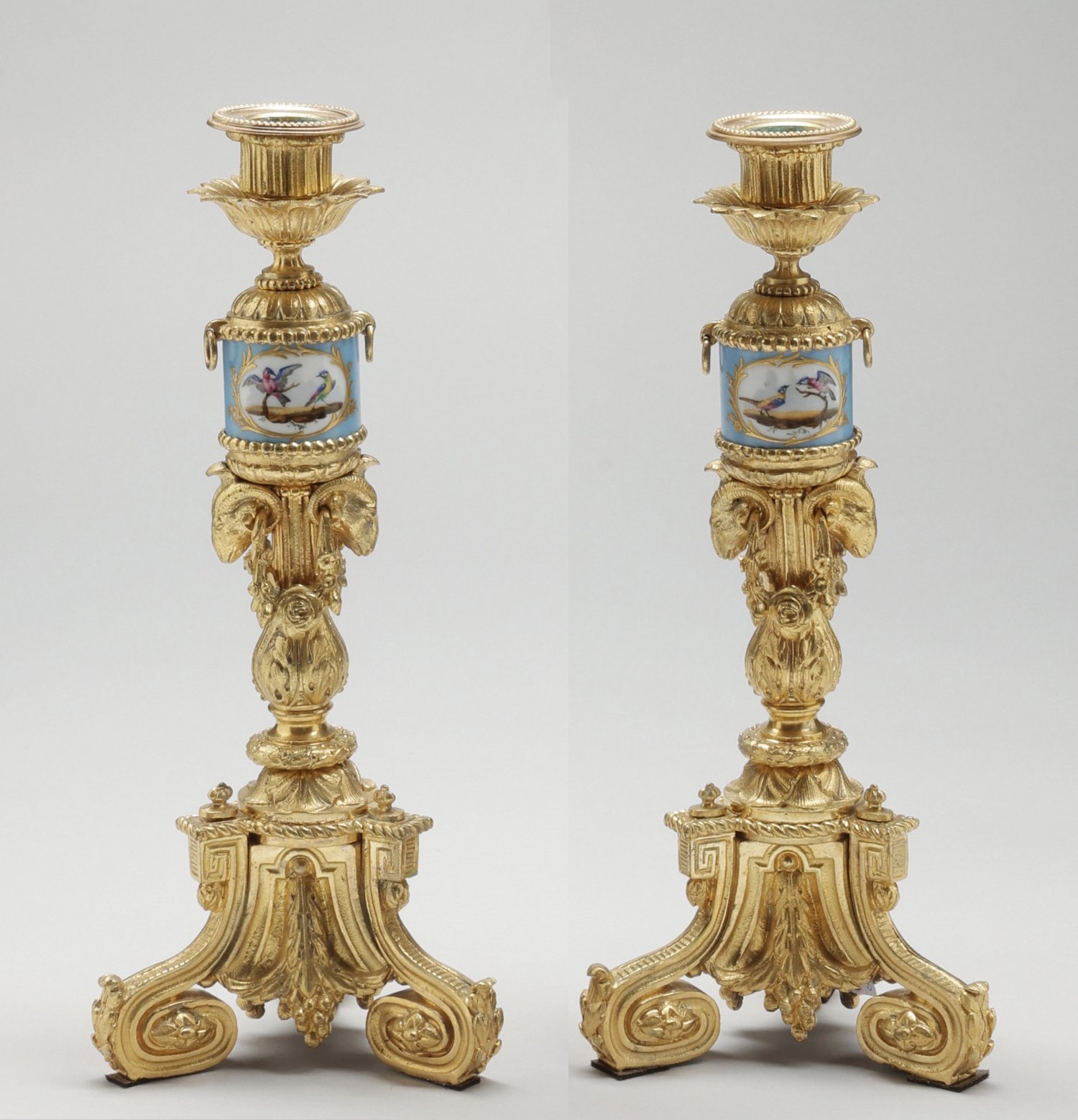 Paar Napoleon III-Kerzenleuchter 1-flg.; Bronze, vergoldet sowie polychrom gestaltete Porzellaneinsätze. Über stark eingerollten Voluten mehrfach gegliederter Balusterschaft, flankiert von Widderköpfen. Porzellaneinsätze mit hellblauem Fond sowie goldgerahmten Reserven mit unterschiedlichen Vogelmotiven. Vasenförmige Tüllen. H. 29 cm.