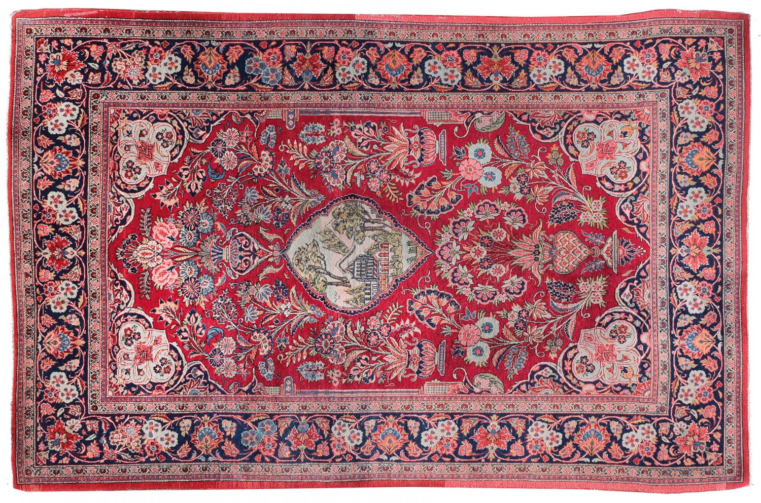 Antike Keschan-Brücke Persien. Um 1930. Wolle auf Baumwolle. Im roten Innenfeld kartuschenförmiges Zentralmedaillon mit Palastarchitektur sowie große blütengefüllte Vasenmotive und Blütendolden. Umlaufend breite, dunkelgrundige Bordüre aus Blütenranken und großen Palmetten. 202 cm x 130 cm.