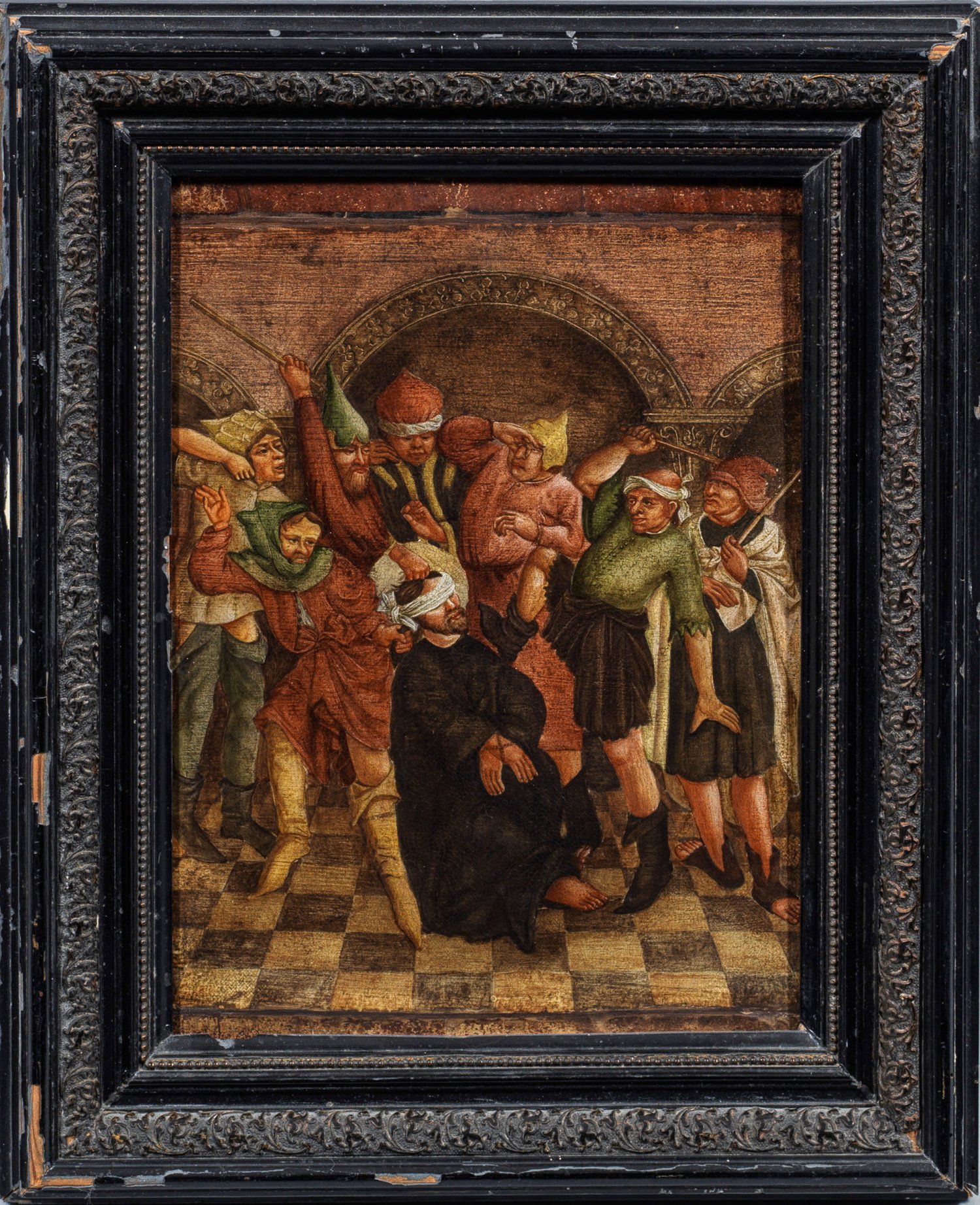 Deutscher Meister (um 1515-1520) geschildert. Verspottung Christi Die vorliegende Tafel dürfte auch aufgrund der Größe mit Sicherheit einst Teil eines größeren Passionsaltares gewesen sein. Für eine Datierung um 1520 spricht außer dem Figurenstil insbesondere die Architekturdarstellung mit Säulenarkaden, wie sie in vergleichbarer Weise bei dem um 1509 geschaffenen Holzschnitt "Die Dornenkrönung" von Albrecht Dürer vorkommt. Öl (u. Tempera?)/Holztafel. 25,5 cm x 31 cm. Rahmen. Die Komposition der Figurengruppe geht auf zwei verschiedene bedeutende Meister zurück: der Verspottung Christi aus dem 1468 datierten Krakauer Augustineraltar von Nikolaus Haberschrack, der um 1454-1486 in Krakau tätig war - der damaligen Hauptsstadt des Königreichs Polen. Wie andere im damaligen Polen tätige Maler des 15. Jhs. war auch Haberschrack unmittelbar von der Kunst in Bayern, Franken und Nürnberg beeinflusst, zu der enge Beziehungen bestanden. Dies erklärt, dass er die Figur des Christus tretenden Schergen vom sog. Meister der Worcester-Kreuztragung (um 1430) übernahm, wie eine Zeichnung im British Museum (Inv. Nr. 1895-9-15-962.) belegt. German painter active circa 1520, probably in Franconia. Oil (and tempera?) on panel.