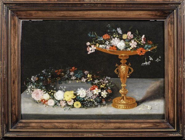 Vor einem dunklen Hintergrund auf einer grau changierenden Tischplatte arrangiertes Stillleben aus einem Kranz aus verschiedenen, naturgetreu und minutiös fein gemalten, duftigen Blüten und einer prunkvollen, goldenen, mit Blumen gefüllten Renaissance-Tazza, von der ein einzelner, zarter, weißer Blütenstängel und ein Blütenblättchen herabgefallen sind. Neben der Tazza versinnbildlichen die Blumen eine ambivalente Symbolik von Vergänglichkeit, irdischer Schönheit und Sinnlichkeit. Die für Jan Brueghel d. J. typischen Farben - sowohl in den Blumen als auch der glänzenden Tazza - sind leicht pastos aufgetragen und vermitteln einen leuchtenden Eindruck. Das Gemälde entstand zu Beginn der 1630er Jahre und steht mit seiner Blumenmalerei, wie es für die früheren Werke üblich ist, noch in der Tradition seines Vaters Jan Brueghel d. Ä. (Vgl. Klaus Ertz und Christina Nitze-Ertz: "Jan Brueghel der Ältere", Band 3, Lingen 2008-2010, Wvz.-Nr. 458-59). Dieser hatte seinen ältesten, hochbegabten Sohn bereits vor dessen Italien-Reise (1622-1625) an seinen Blumenbildern kongenial mitarbeiten lassen (ebd., Wvz.-Nr. 426-29). 1625 musste Jan Brueghel d. J. jedoch abrupt aus Italien zurückkehren, um nach dem überraschenden Tod seines Vaters dessen Werkstatt zu übernehmen. Noch im selben Jahr wurde er in die Antwerpener St. Lukasgilde aufgenommen. Auf dem Höhepunkt seines Ansehens stehend, malte er bis zur Mitte der 1630er Jahre eine Reihe farbenfroher Blumenstillleben, zu denen auch das vorliegende gehört. Jan Brueghel d. J. integrierte hierbei öfters die einzige bekannte Tazza seines Vaters als Vorbild und Hauptmotiv für völlig eigenständig weiterentwickelte Kompositionen (Vgl. Klaus Ertz: "Jan Breughel der Jüngere (1601-1678). Die Gemälde mit kritischem Werkkatalog", Freren 1984, Wvz.-Nr. 285-, 287-289a). Auch ein auf der Tischplatte liegender Blumenkranz findet sich in seinen Stillleben aus dieser Zeit (Nr. 288, 290). Öl/Eichenholztafel. Verso Brandstempel der Antwerpener Gilde (Burg und zwei Hände) sowie Ligatur-Monogr. "LS" des Tafelmachers Lambrecht Steens (tätig um 1608-1638). 36,6 cm x 53 cm. Rahmen.
