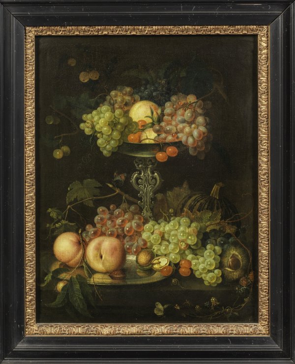 Auf einem Tisch bzw. einer silbernen Tazza und einem Teller arrangiertes, prunkvolles Stillleben aus verschiedenen einheimischen und südländischen Früchten (Weintrauben, Pfirsichen, Brombeeren, Stachelbeeren, Maronen, Walnüssen und Kürbis); im Vordergrund, an der Tischkante bzw. auf einer Brombeerenranke eine kleine Schnecke und ein Schmetterling. Motiv- und stiltypisches Stillleben des Künstlers. Marrel lernte 1624-1632 bei Georg Flegel in Frankfurt, 1632 ging er nach Utrecht in die Werkstatt Jan Davidsz. de Heem. Nachdem er bereits in Utrecht eine eigene Werkstatt betrieben und Abraham Mignon als Schüler aufgenommen hatte, war er 1650-1665 in Frankfurt ansässig. Dort heiratete er 1651 Johanna Sybilla Merian (Witwe von Matthäus Merian d. Ä.), wodurch er der Stiefvater und spätere Lehrer von Maria Sibylla Merian wurde. In seinem Oeuvre beeinflussten ihn außer Jan Davidsz. de Heem auch Roelant Savery und Ambrosius (II) Bosschaert. Marrel hat die hier dargestellte Tazza mehrfach in seinen Stillleben als Motiv verwendet. Am nächsten steht dem vorliegenden Gemälde ein vom RKD dokumentiertes, signiertes und 1671 datiertes Früchtestillleben, was eine Datierung um 1670 für schlüssig erscheinen lässt. Öl/Lwd., doubl.; 52 cm x 42 cm. Rahmen.
