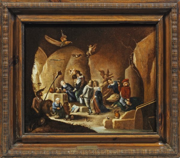 Teniers und seine Werkstatt haben sich ab ca. 1632 oft dem Thema der Versuchung des Hl. Antonius gewidmet. Als Reflex auf die tiefen Verwerfungen durch den 30-jährigen Krieg, die Pest, Hexenglauben und Magie schilderte er diese zuweilen auch in Kombination mit dem Motiv einer Mahnung an die Sieben Todsünden (Hochmut, Habgier, Wollust, Zorn, Völlerei, Hass, Neid und Trägheit). Diese finden sich auch in diesem Gemälde, symbolisiert in den unterschiedlichen Figuren, Fabelwesen und Gesten. Öl/Holztafel. 45,5 cm x 55 cm. Rahmen.