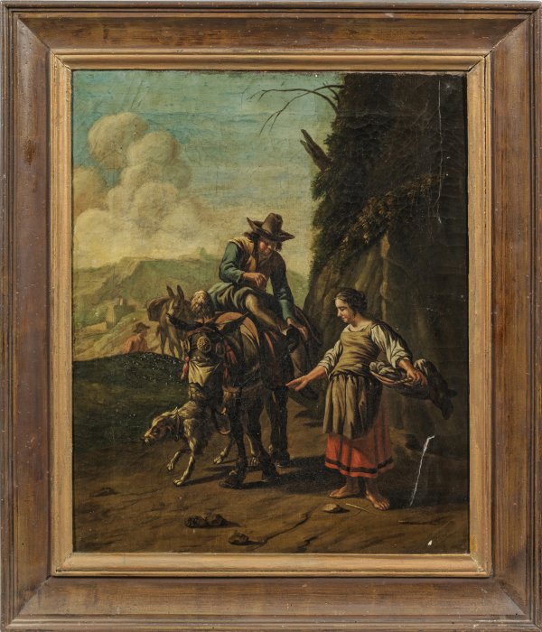 Dominant in den Vordergrund komponierte Figurengruppe mit effektvollen Lichtkontrasten. Durch die Bamboccianti, Nicolaes Berchem und andere niederländische, auf italienische Landschaften und Genremotive spezialisierte Künstler beeinflusstes Gemälde. Öl/Lwd.; L. u. am Stein undeutl. Ligatur-Monogr.; 47 cm x 38 cm. Rahmen der Zeit bzw. Original-Rahmen.