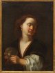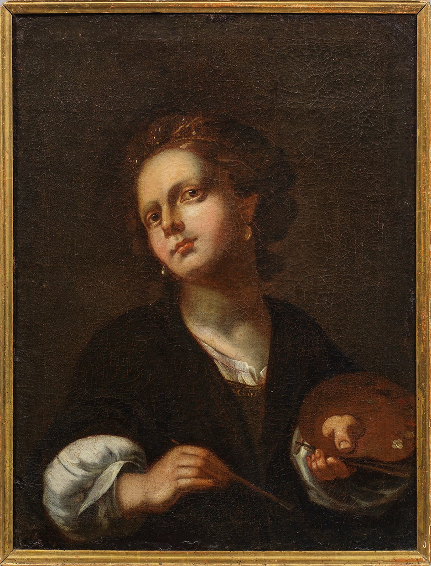 Gegenstücke. Brustbildnisse junger Frauen mit ihren jeweiligen Attributen - Pinsel und Palette bzw. Skulpturenkopf und Punktierzirkel - als Sinnbilder für die Künste. Sichtlich beeinflusst sind die Gemälde von Werken des Florentiner Barock-Malers Giovanni Martinelli (1600/04 - 1659), der Stilelemente der römisch-lombardischen Caravaggisten aufnahm und insbesondere Allegorien und Personifikationen von Künsten, Tugenden oder Lastern darstellte. Öl/Lwd., doubl; 57,5 cm x 44 cm.