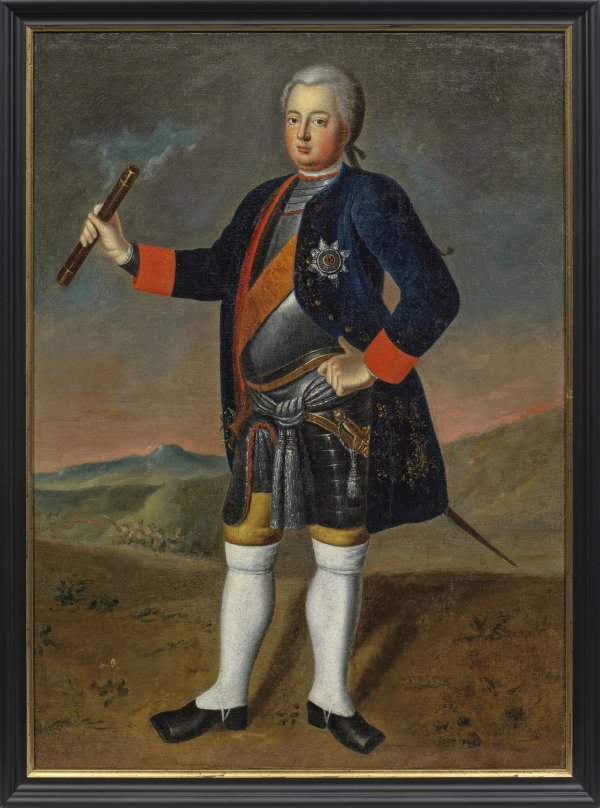 Ganzfiguriges, repräsentatives Bildnis Friedrich Wilhelms in gelber Hose und glänzendem Kürass, darüber die orangerote Schärpe des Hohen Ordens vom Schwarzen Adler, ein dunkelblauer, goldbestickter Uniformrock mit roten Aufschlägen sowie weißen Gamaschen über schwarzen Stiefeln, auf der Brust der Stern des Schwarzen Adlerordens. Mit der rechten Hand hält der König einen Feldherrenstab, während er die linke Hand in selbstbewusster Pose in die Taille stützt. Der Landschaftshintergrund wird durch ein angedeutetes Reitergefecht belebt. Zu diesem ikonographisch außergewöhnlichen, ganzfigurigen Feldherrenporträt des Königs ohne Standesinsignien gibt es nur wenige Vergleichsbeispiele. Hierzu zählen das Bildnis des Königs aus der Folge der Fürstenbildnisse im Stadtschloss in Eisenach und ein dokumentiertes, nur in Details abweichendes Gemälde, das sich einst in Schloss Poplitz befand. Öl/Lwd.; 74 cm x 54 cm. Rahmen.