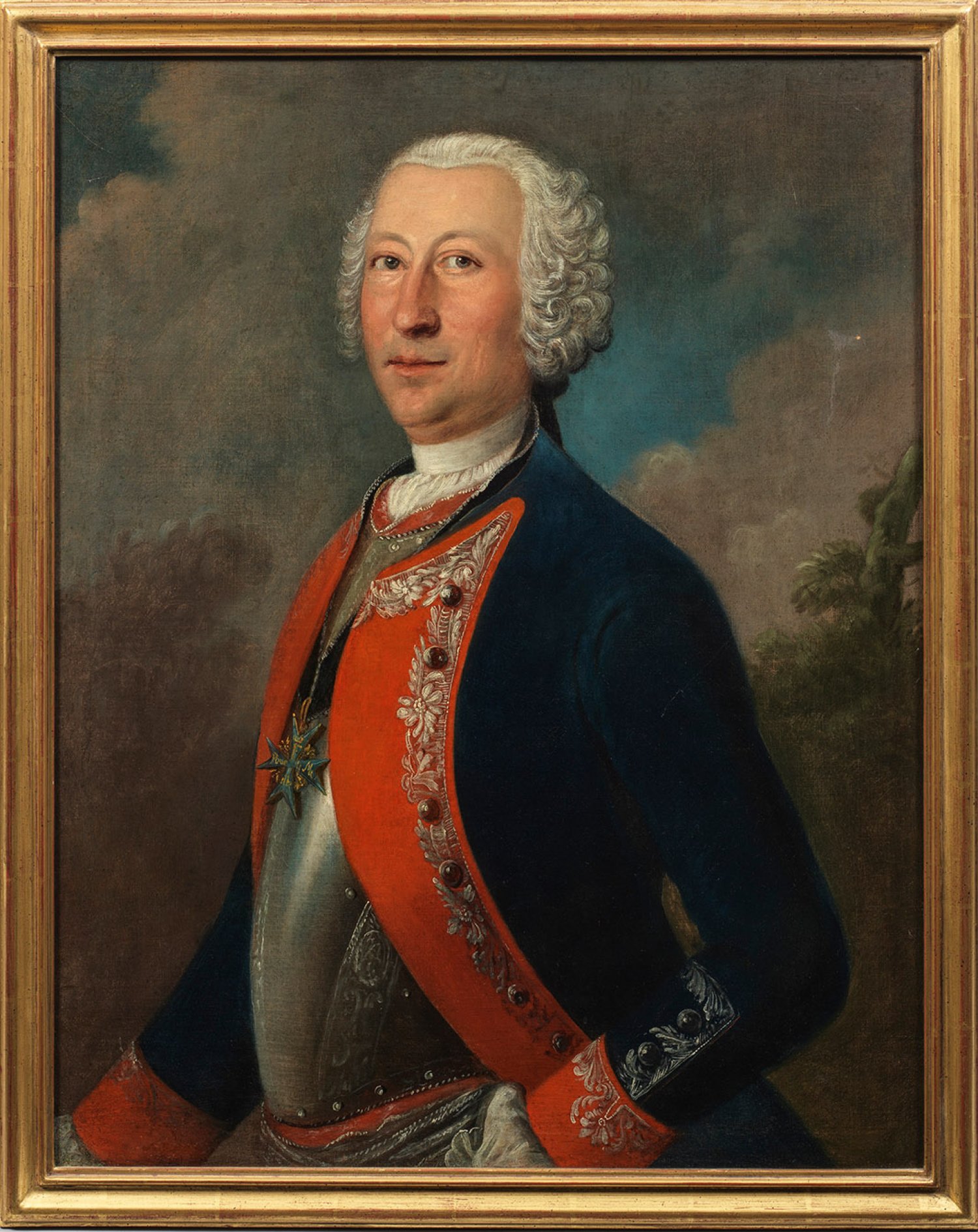 Repräsentatives, ausdrucksvoll charakterisierendes Bildnis des preußischen Offiziers (1692 - 1775) im Halbprofil, unter der Uniform ein Kürass, auf der Brustmitte der Orden Pour le Mérite. Künstlerisch qualitätvolle, feinflüssig ausgeführte Darstellung von historischer Bedeutung für die preußisch-deutsche Geschichte. Dieses Gemälde dürfte kurz nach dem Ersten Schlesischen Krieg (1740 - 1742) entstanden sein, in dem Kanitz für seine Tapferkeit den Orden Pour le Mérite erhielt. Öl/Lwd.; Verso bez. "Haubtmann v Kanitz". 79 cm x 63,5 cm. Rahmen.