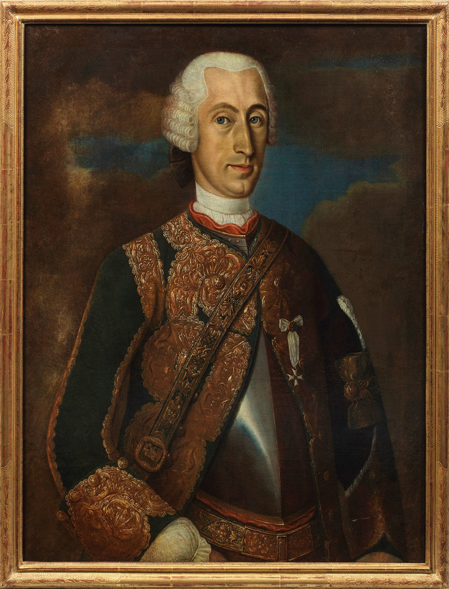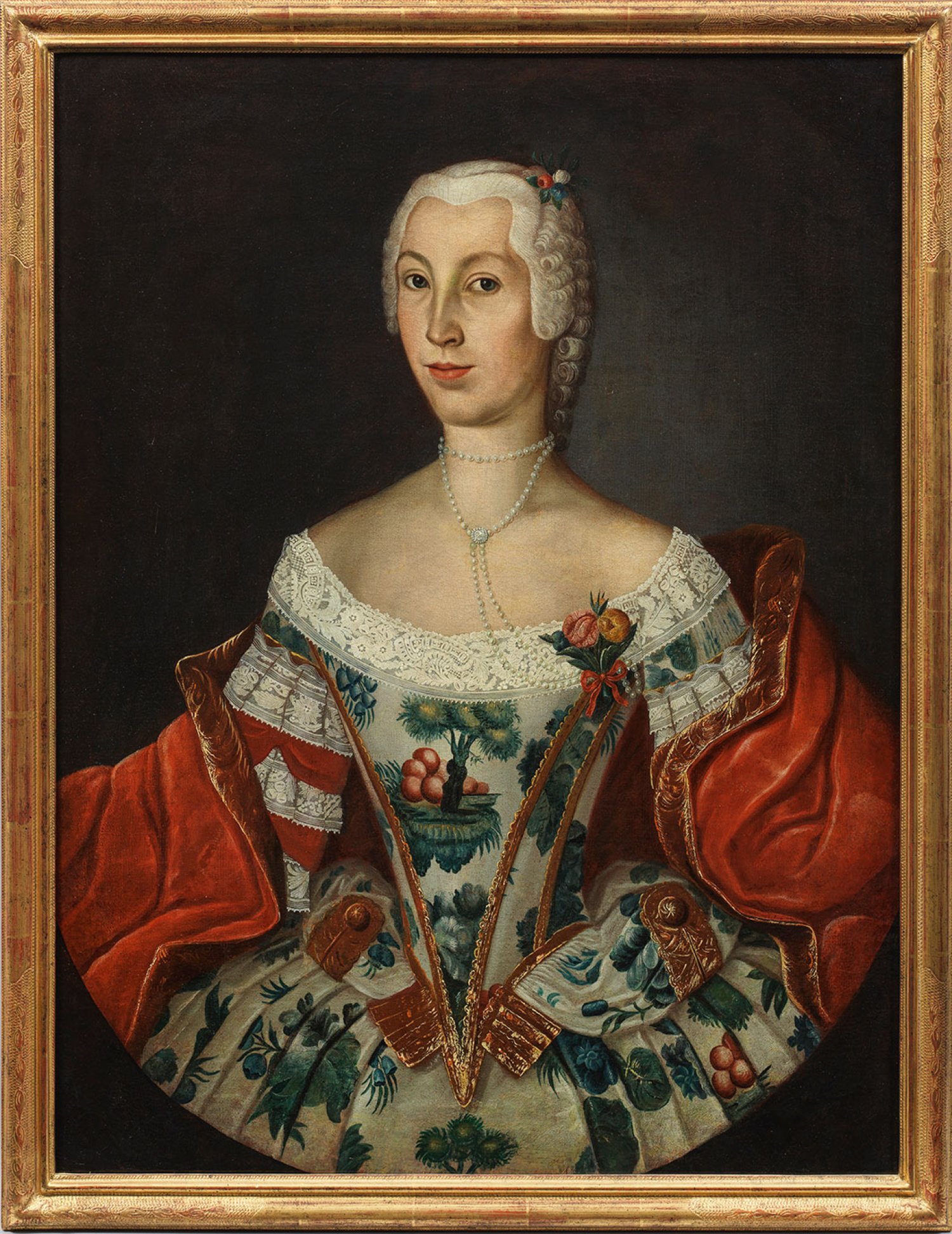 Gegenstücke. Repräsentative höfische, 1742 gemalte Adelsbildnisse. Dietrich von Kayserlingk (1713 - 1793) im glänzend polierten Kürass, die Jacke mit prunkvoller Brokatstickerei und dem Johanniterorden am Band; seine Frau Anna Alexandrine (1723 - 1784) mit Perlenkette in einem eng taillierten Kleid mit opulenter Stickerei aus südländischen Früchten und Bäumen. Öl/Lwd.; Ein Gemälde verso dat. 1742, jedes Porträt mit ausführlichen Angaben zu den Dargestellten. Rest.; 87 cm x 67 cm. Rahmen.