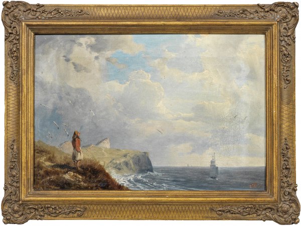 Frühes atmosphärisch gestimmtes Werk des bedeutenden Landschafts- und Marinemalers, der mit Vorliebe Strand- und Küstenmotive aus Holland und Norwegen schilderte. Der hochtalentierte Achenbach besuchte bereits ab 1827 die Kunstakademie in Düsseldorf, 1832-1836 studierte er in der Landschafterklasse von Johann Wilhelm Schirmer. 1832/33 unternahm er mit seinem Vater eine ausgedehnte Studienreise u. a. nach Rotterdam, Scheveningen, Amsterdam und Riga. Im Entstehungsjahr des vorliegenden Gemäldes 1836 gelang ihm der künstlerische Durchbruch, als Prinz Friedrich von Preußen und König Ludwig I. von Bayern zwei große Gemälde Achenbachs erwarben. Öl/Lwd.; R. u. Ligatur-Monogr. "AA" mit Dat. 1836. 25 x 36,5 cm. Rahmen.