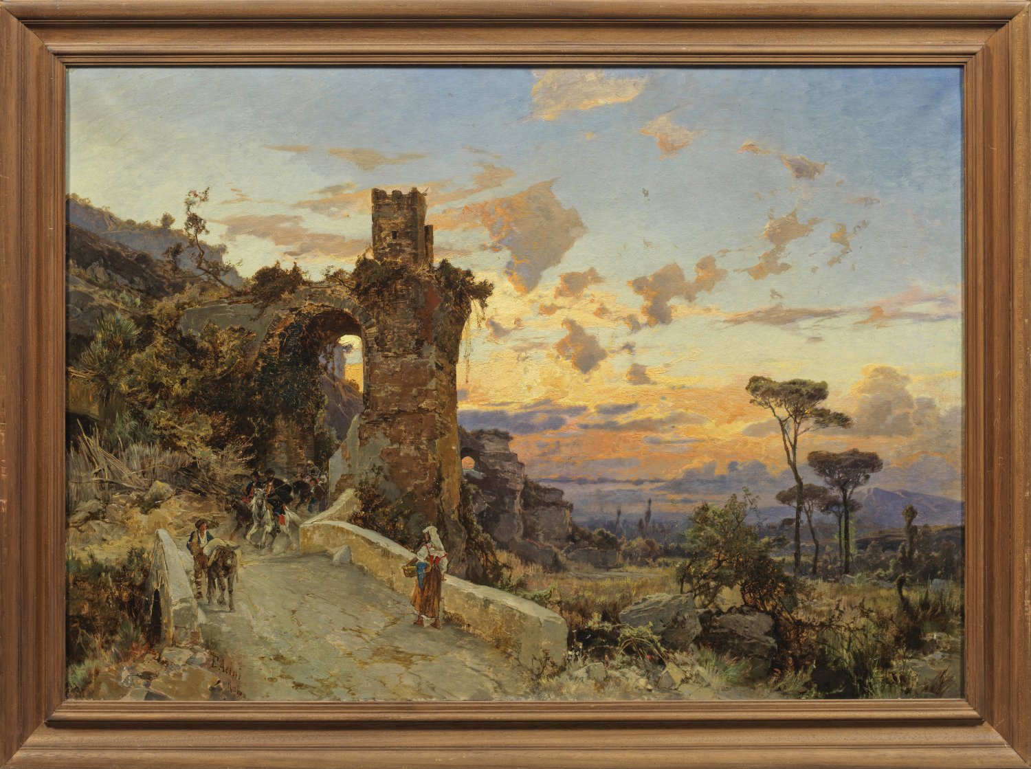 Koloristisch meisterhaft die atmosphärische Stimmung einfangendes, impressiv aufgefasstes Werk des Schweizer Malers. Aerni studierte 1870-1874 in Lausanne und Modena, bevor er nach Rom ging, um sich der deutschen Künstlerkolonie anzuschließen. In Rom wurde Aerni Schüler Salomon Corrodis an der Accademia di San Luca und assistierte ihm im Atelier. In Italien schuf Aerni neben Landschaften und Veduten mit Vorliebe Darstellungen des ländlichen und städtischen Alltagslebens. Öl/Lwd.; L. u. sign. mit Ortsangabe Roma (Rom). 70 cm x 100 cm. Rahmen.