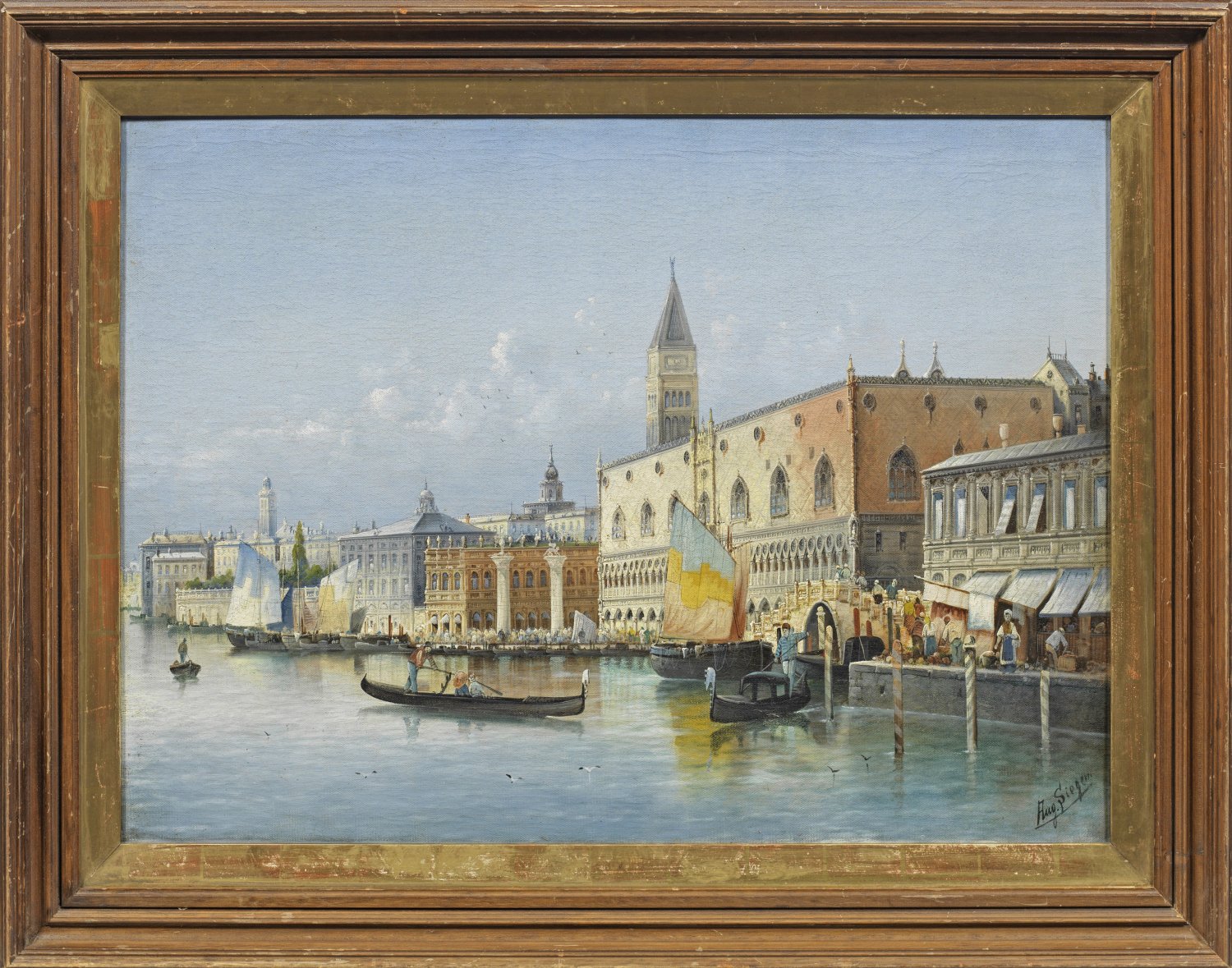 Das Gemälde zeigt die beliebte Ansicht vom Wasser aus auf die Riva degli Schiavoni in Venedig mit Zecca (Münzprägestätte), Markusturm, Biblioteca Marciana, Piazzetta mit den Säulen mit Löwe und dem Hl. Teodoro sowie den Palazzo Ducale mit der Brücke Ponte dei Sospiri, die zum Prigioni Nuove führt. An dem belebten Kai liegen Holzboote mit gehissten Segeln und einige Gondolieri befördern ihre Fahrgäste. In harmonisch abgestimmter Tonigkeit mit feinem Malduktus ausgeführtes, stiltypisches Werk des vielgereisten Künstlers. Obwohl das Oeuvre von August von Siegen sehr umfangreich ist und überwiegend aus gut gemalten Veduten und einigen Capriccios besteht, ist über die Künstlerpersönlichkeit selbst nur wenig bekannt. Öl/Lwd.; R. u. sign.; 58 cm x 79,5 cm. Rahmen.