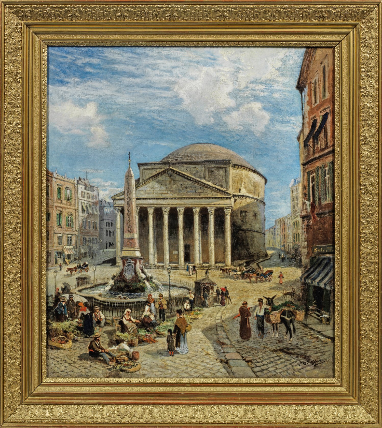 Blick über die Piazza della Rotonda und den Brunnen mit dem altägyptischen Obelisken auf das berühmte antike Bauwerk des Pantheons. Durch eine reiche, pittoreske Staffage belebte Vedute. Koloristisch subtil nuancierte Impression, in der Hiller feinfühlig das intensive mediterrane Licht und die morgendliche Stimmung wiedergibt. Der Landschafts- und Vedutenmaler, der Italien bis nach Neapel bereiste, beschickte 1866-1883 die Berliner Akademie-Ausstellungen. Öl/Lwd., doubl.; R. u. sign.; 79 cm x 68 cm. Rahmen.