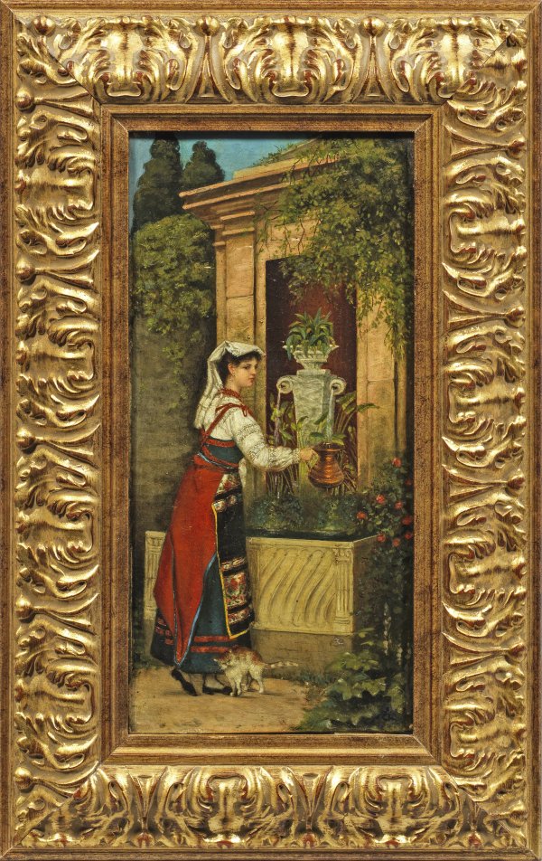 Fein gemaltes, seltenes Werk der Künstlerin, die ihre künstlerische Ausbildung bei ihrem Vater, dem Maler August von Bayer, erhielt. 1869-1880 beteiligte sie sich mit mehreren Bildnissen an Ausstellungen. Zunächst in München ansässig heiratete sie später den Gelehrten Konstantin Winterberg und ging mit ihm nach Karlsruhe und Heidelberg, Öl/Lwd.; Auf der verso umgeschlagenen Kante sign. u. dat. 1883. 40,5 cm x 19,5 cm. Rahmen.