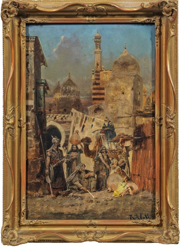 Pittoreske Szene aus Desouk in Ägypten mit einem Krieger, Reiter auf einem Kamel und mehreren weiteren Figuren vor dem Hintergrund zweier Moscheen. Alott studierte 1868-1873 an der Kunstakademie in Wien, anschließend ging er nach Düsseldorf, wo er von Oswald Achenbachs Landschaftsmalerei geprägt wurde. Außer Österreich und Italien bereiste er auch Nordafrika, insbesondere Tunesien und Ägypten. Seine Landschaften und Veduten verband er hierbei oft mit Genremotiven und Szenen aus dem Volksleben. Öl/Holztafel. R. u. sign. u. undeutl. dat.; Verso auf altem Etikett betitelt. 39 cm x 26,5 cm. Rahmen.