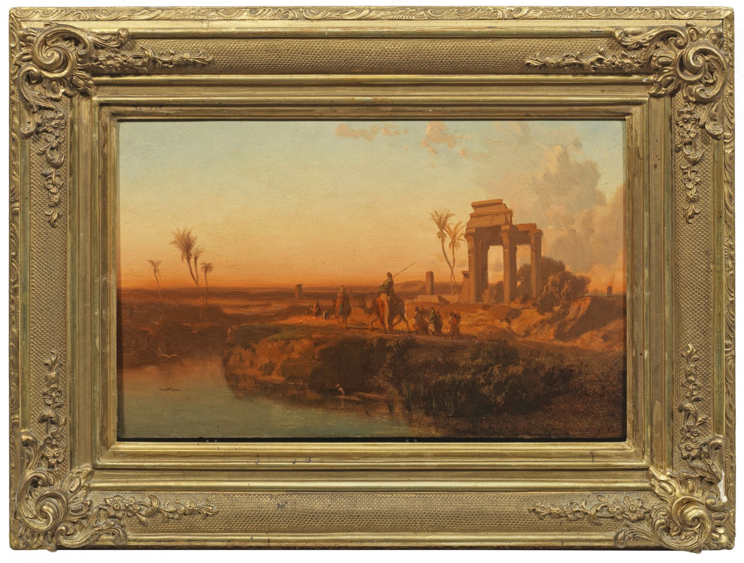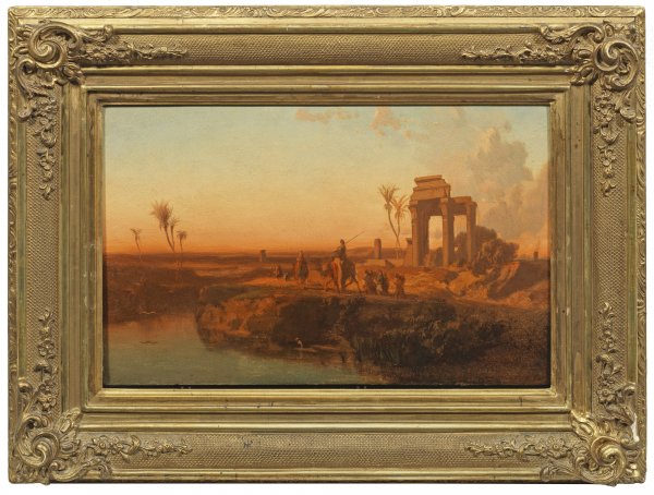 Noch vor Sonnenaufgang ist die Orientlandschaft mit nur wenigen Palmen in ein intensives rötliches Licht getaucht. Eine Karawane zieht gemächlich zwischen Flussfer und Tempelüberresten vorbei. Geyer gelingt es mit koloristisch meisterhaft nuancierter Farbsetzung die Himmelsatmosphäre zwischen Nacht und Morgen im Bild einzufangen. Der an den Akademien in Berlin, München und Dresden ausgebildete Künstler war mehrere Jahre in Rom ansässig, bevor er sich im Auftrag des griechischen Königs 1847 nach Konstantinopel und in den Orient begab. Im Jahr 1850 unternahm Geyer zusammen mit dem Berner Architekten Theodor Zeerleder eine Reise auf dem Nil. Aus diesen Reiseerfahrungen schöpfte er Motive für seine gefragten Orientbilder, die ab 1856 regelmäßig in Berlin auf den großen Ausstellungen angeboten wurden. Öl/Holz.; R. u. monogr.; 25,5 cm x 38 cm. Rahmen.
