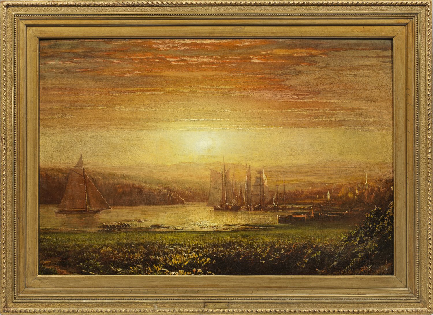 In warmen Goldorangetönen gemalte, impressiv aufgefasste, atmosphärisch gestimmte, wohl um 1860 entstandene Landschaft Shattucks. Dieser gehörte zu den bedeutenden Künstlern der zweiten Generation der Hudson River School bzw. White Mountain School. Seine poetischen Stimmungslandschaften aus Neuengland spiegeln sein feines Gefühl für Licht und Kolorit wider. Shattuck studierte 1851/52 bei Alexander Ransom in Boston und an der National Academy of Design in New York City. 1854 malte er zum ersten Mal in den White Mountains von New Hampshire. Im folgenden Jahr stellte er erstmals sowohl an der National Academy als auch am Boston Athenaeum aus. 1861 wurde er zum vollen Akademiemitglied ernannt. 1879 erwarb er eine Farm in West Granby, Connecticut, wo er jedoch 1888 krankheitsbedingt die Malerei aufgeben musste. Werke Shattucks befinden sich u. a. im Metropolitan Museum of Art und Brooklyn Museum in New York. Öl/Lwd.; R. u. sign.; 51 cm x 76 cm. Rahmen.