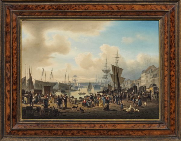 Atmosphärisch gestimmte, topografisch detailreiche, in sehr feiner Malerei ausgeführte Vedute, welche den Hafen mit seinen großen Segelschiffen und zahlreichen Booten im frühen Morgenlicht mit duftig bewölktem Sommerhimmel zeigt. Belebt wird die Szenerie durch ein geschäftiges, vielfiguriges, pittoreskes Treiben an den Marktständen mit Händlern, Kunden und Passanten, während sich im Vordergrund Hunde tummeln und ein kleines Mädchen zwei Gänse treibt. Historisch bedeutende und künstlerisch meisterhafte Ansicht Hermann Meyerheims, die er im Entstehungsjahr 1876 auf der Berliner Akademie-Ausstellung zeigte. Der Künstler stammte aus der bedeutenden Danziger Künstlerfamilie, ging nach Berlin und spezialisierte sich auf Küstenlandschaften, insbesondere Ansichten mit Hafenmotiven und Architektur. Seit 1864 beschickte er hiermit die Akademie-Ausstellungen in Berlin. Öl/Lwd., doubl.; R. u. sign. u. dat. 1876. 42 cm x 58 cm. Rahmen.