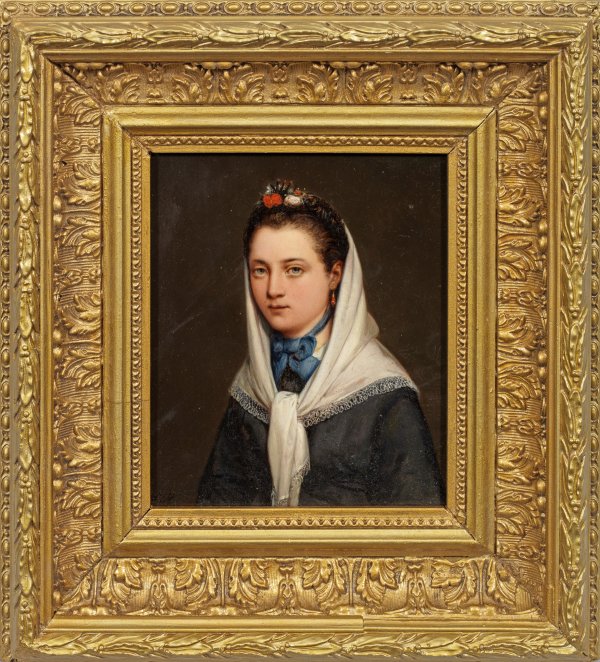 Feinmalerisch ausgeführtes, kleinformatiges Porträt. Der ab ca. 1820 in Amsterdam ansässige und an der Akademie ausgebildete Maler schuf außer Porträts vor allem Genrebilder, die teilw. durch Petrus van Schendel beeinflusst sind, Landschaften, Stadtansichten und aktuelle Ereignisse. Öl/Mahagonitafel. L. u. monogr, u., dat. 1865. 16,5 cm x 13,5 cm. Rahmen.