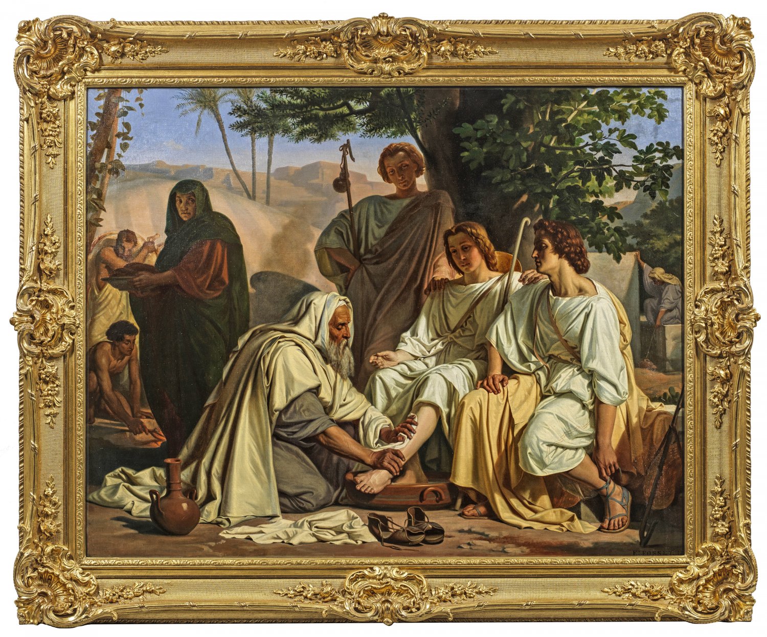 Szenische Darstellung nach der biblischen Erzählung im Alten Testament (Genesis 18, 1-15). Unter kühlendem Schatten eines Baumes sitzen bzw. stehen die drei Engel in Gestalt von Jünglingen, denen der alte Abraham ehrerbietig die Füße wäscht, um ihnen anschließend ein reiches Gastmahl zu bereiten, das er selbst auftrug. Im Hintergrund ist Abrahams Frau Sara zu sehen, die wegen ihres Alters eigentlich keine Kinder mehr gebären kann, und sich skeptisch und misstrauisch zu den fremden, jungen Männern dreht. Die Gäste erkundigen sich allerdings nach der sich versteckt haltenden Sara und kündigen ihr das Wunder der Geburt eines Sohnes in einem Jahr an, was tatsächlich geschieht und ein Sohn kommt zur Welt, der Isaak genannt wird. Das Gemälde gehört nicht nur aufgrund seines Formates sondern auch der künstlerischen Qualität, die in der durchdachten, ausgewogenen Komposition, der Figurenschilderung und der effektvollen Wiedergabe des Lichts liegt, zweifellos zu den Hauptwerken des Malers. Fossey studierte ab 1844 an der École des Beaux-Arts bei Merry-Joseph Blondel und Léon Cogniet und erhielt 1852 den renommierten Rom-Preis. 1846-1869 war er mit Werken im Pariser Salon vertreten, 1855 und 1867 auch auf den Weltausstellungen in Paris. 1860-1865 lehrte er selbst an der École des Beaux-Arts. Schwerpunkt seines Oeuvres waren neoklassizistische Gemälde mit Allegorien und biblischen Motiven. Öl/Lwd.; R. u. sign. u. dat. 1854. 114 cm x 147 cm. Rahmen.