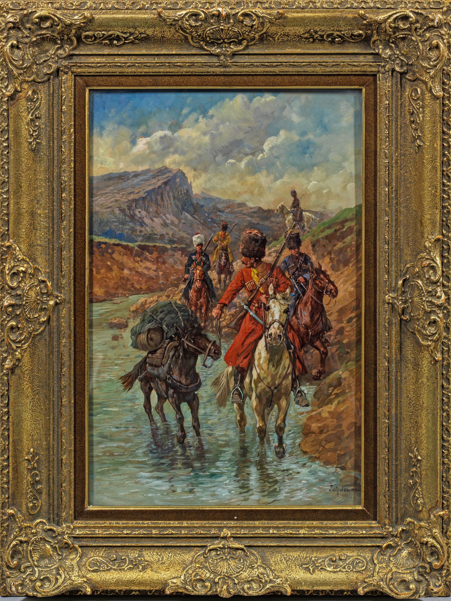 Lebendige, bewegte Darstellung des auf historische Reiter- und Schlachtenmotive spezialisierten Künstlers. Viele seiner Gemälde zeigen Kosaken und Motive aus dem Siebenjährigen Krieg. Öl/Malkarton. R. u. sign.; 60 cm x 40 cm. Rahmen.