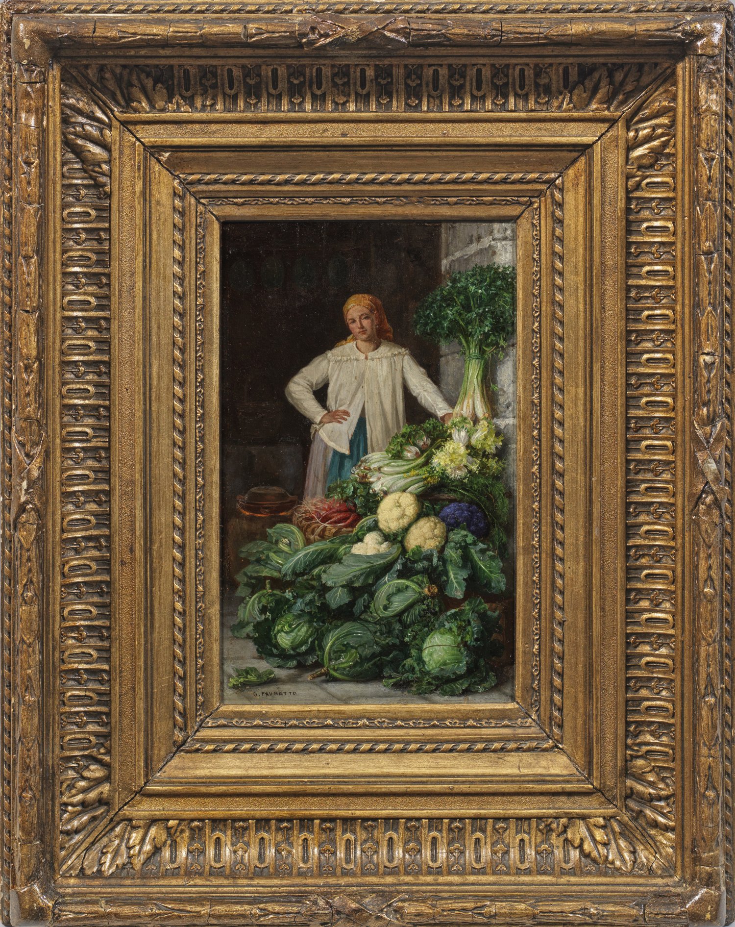 Feinmalerisch ausgeführte Darstellung mit großem Realismus und meisterhafter Wiedergabe der Stofflichkeit. Wohl um 1878 entstandenes, dem frühen Oeuvre zuzuordnendes Kabinettbild des bedeutenden italienischen Malers, der durch seine subtil beobachteten Alltagsszenen aus Venedig zugleich einer der höchst populären Künstler wurde. Statt mythologischen und historischen Themen widmete er sich mit Vorliebe heiteren Szenen aus dem 18. Jh. und insbesondere zeitgemäßen Motiven mit einfachen Menschen bei ihren gewöhnlichen Tätigkeiten, bei der Arbeit und beim Spielen. Favretto reüssierte hiermit auch in gehobenen Gesellschaftskreisen bis hin zu Königin Margharete von Italien. Favretto studierte 1864-1878 an der Akademie in Venedig und debütierte 1873 erfolgreich auf der Ausstellung der Brera-Akademie in Mailand. 1878 nahm er an der Weltausstellung in Paris teil, wodurch seine glänzende Künstlerlaufbahn auch auf internationaler Ebene begann. 1880 stellte Favretto erneut in der Brera-Akademie und in Turin aus und gewann den renommierten Prinz-Umberto-Preis. Noch kurz vor seinem frühen Tod an Typhus manifestierte er 1887 seinen Ruf als herausragender Künstler auf der Nationalen Kunstaustellung in Venedig. Öl/Holztafel. L. u. sign.; 30 cm x 18 cm. Wohl Original-Rahmen.