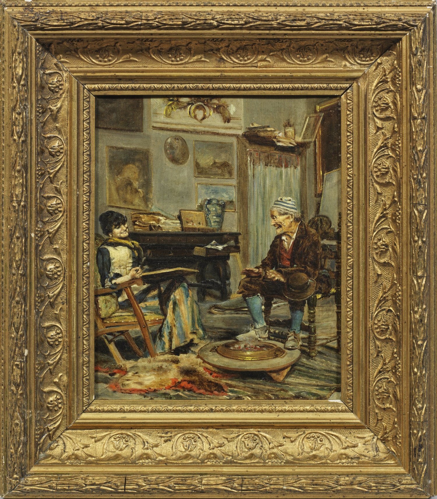 In einem mit Gemälden, Zeichnungen und Malutensilien reich ausgestatteten Salon sitzt die Malerin mit Zeichenblock, ihr gegenbüber ein lachender alter Herr mit Hut und Nachtmütze als Modell. Motiv- und stiltypisches Kabinettbild Volpes, der im heiteren Genre impressionistische und realistische Stilmittel verbindet. Öl/Lwd.; L. u. Reste einer Sign.; 24 cm x 19 cm. Rahmen.