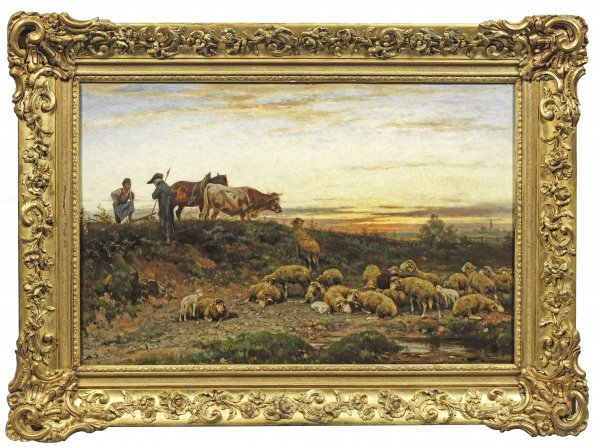 Rastender Schäfer im Gespräch mit einem Bauern vor einem Abendhimmel. Charakteristisches Schäfermotiv Meissners mit impressiv erfasster Landschaft. Meissner, der an der Dresdener Akademie von Robert Kummer ausgebildet wurde und ab 1870 in München ansässig war, schuf eine große Reihe in Motiv und Stil vergleichbarer, winterlicher Schäferszenen. Er zählt zu den Hauptmeistern der Münchner Tiermalerei neben Anton Braith, Otto Gebler und Heinrich v. Zügel. 1875 erwarb die Dresdner Gemälde-Galerie eine winterliche Schäferszene. Öl/Lwd.; Verso auf einem originalen Klebezettel vom Künstler bez. u. betitelt mit Münchner Adresse. 64,5 cm x 103 cm. Rahmen.