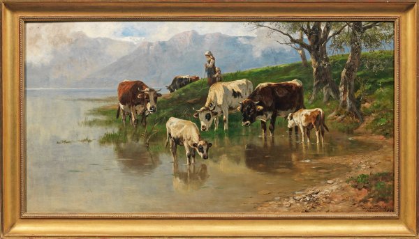 Mit seiner meisterhaft eingefangenen Lichtstimmung und lebendigen Tierdarstellung für das Oeuvre Malis motiv- und stiltypisches Werk. Der ab 1858 in München tätige Künstler wurde auf einer Studienreise nach Paris 1865 durch Constant Troyon angeregt, sich der Tiermalerei zu widmen. Später wurde Mali ein Wegbereiter der Plein air-Malerei. Neben dem befreundeten Maler Anton Braith gilt er als einer der bedeutendsten deutschen Tiermaler in der 2. Hälfte des 19. Jhs.; gewidmet ist ihnen das Braith-Mali-Museum in Biberach. Öl/Lwd., R. u. sign. u. dat. 1900 mit Ortsangabe München. 61 cm x 115 cm. Rahmen.