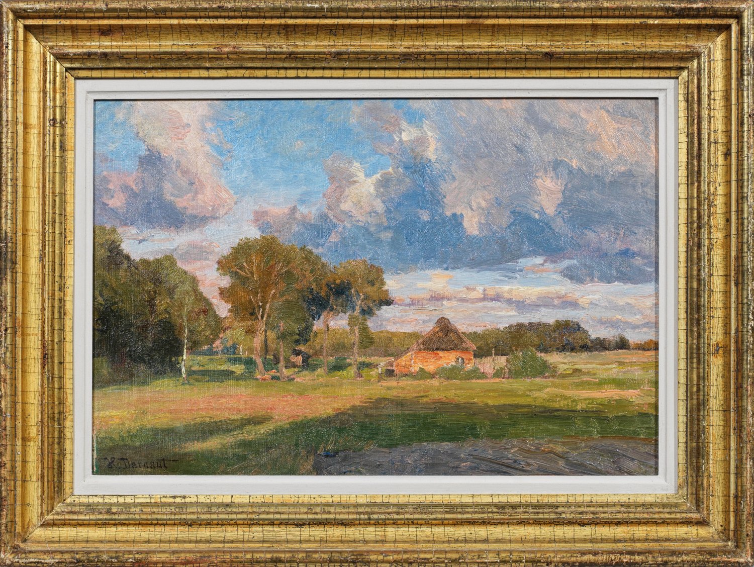 Impressionistische Landschaft mit Blick auf ein Gehöft. In Motiv und Stil charakteristisches Werk Darnauts, der zu den bedeutenden Vertretern des österreichischen Stimmungsimpressionismus gehört. Darnaut studierte 1871/72 an der Wiener Akademie bei Eduard Peithner von Lichtenfels, danach ging er mit einem Stipendium nach Düsseldorf, wo er bei Andreas Achenbach, Robert Meyerheim und Johannes Wortmann lernte. 1876 kehrte er nach Wien zurück und wurde 1877 Mitglied des Künstlerhauses. Wesentliche Einflüsse empfing Darnaut durch den Impressionisten Gustav Schönleber, bei dem er in den 1890er Jahren ein Jahr lang Unterricht in Karlsruhe nahm. Für die Pariser Weltausstellung von 1900 schuf er gemeinsam mit Erwin Pendl ein großes Vogelperspektivbild von Wien. Zu seinen Hauptwerken gehören Gemälde, die vom Kaiser von Österreich angekauft wurden sowie die Landschaftsbilder für das Naturhistorische Museum in Wien. Öl/Malkarton. L. u. sign.; Verso betitelt. 26,5 cm x 39,5 cm. Rahmen.
