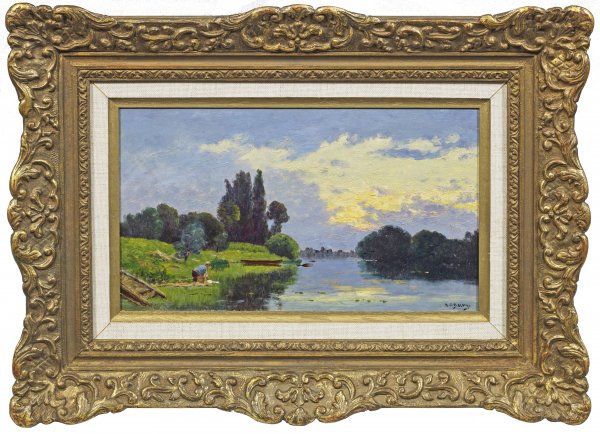 In der effektvollen Lichtstimmung charakteristische Landschaft des Künstlers, der bei seinem Vater, dem Daubigny-Schüler Hippolyte-Camille Delpy lernte. Als später Vertreter des poetischen Impressionismus und der Schule von Barbizon schilderte er, wie in diesem Werk, oft Flussufer an der Oise und Seine, Motive mit stillen Gewässern und Baumgruppen in der Dämmerung. Öl/Malkarton. R. u. sign.; 18,5 cm x 31 cm. Rahmen.