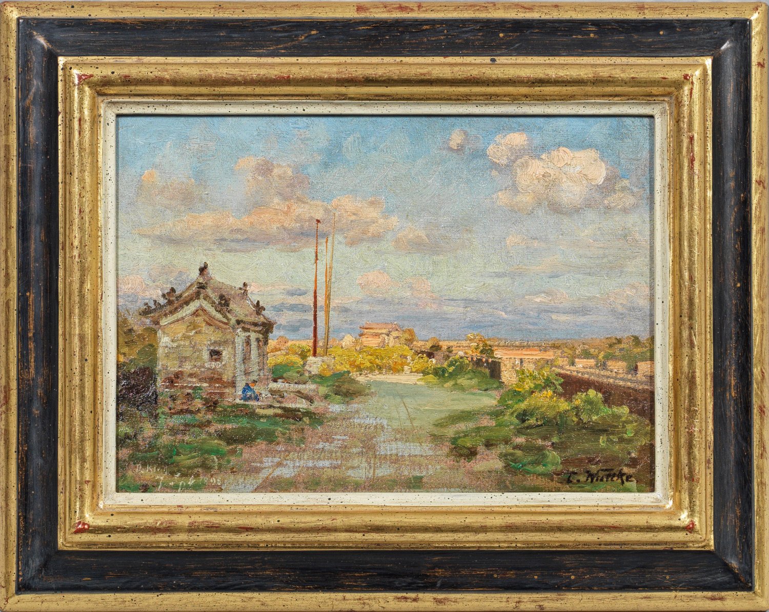 Seltene, impressionistische China-Vedute Wuttkes, entstanden während seiner Weltreise 1897-1899, während der er auch für die deutsche Kaiserfamilie Ansichten der neuen deutschen Kolonien Tsingtau und Kiautschou in China schuf. Wuttke studierte in Berlin und München und war 1877-1880 Schüler Eugen Dückers an der Kunstakademie Düsseldorf. Wuttkes Stil mit seinem spontanen, lockeren Duktus machte ihn zu einem Vorreiter der Impressionisten und Secessionisten. Öl/Lwd.; R. u. sign.; L. u. Ortsangabe Peking mit Dat. 1898. Auf verso montierter, originaler, kleiner Holztafel wohl eigenhändig bez. u. betitelt. 21 cm x 29 cm. Rahmen.
