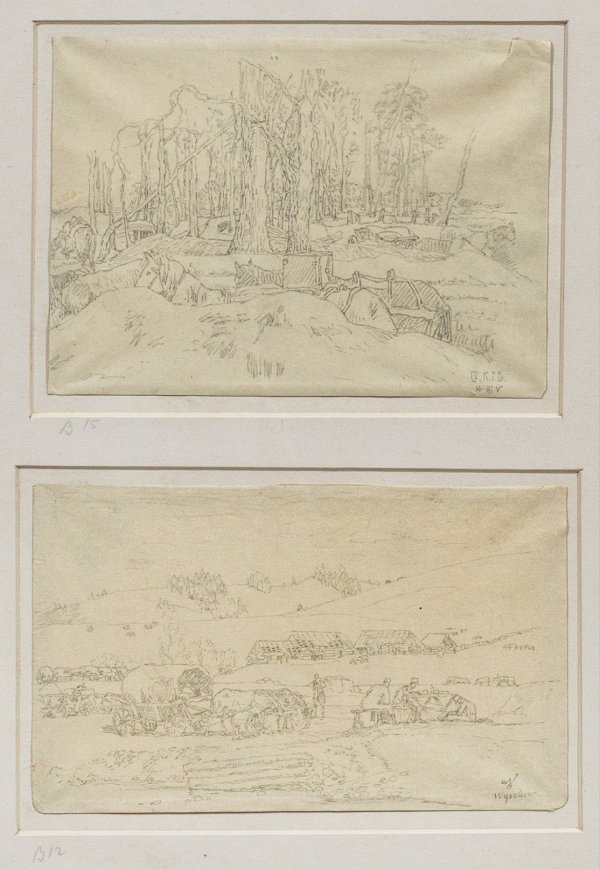Zwei Blätter. Vogeler, der 1915-1917 in den Karpaten, Galizien, Polen und Russland eine Fülle von Zeichnungen schuf, schilderte fast nie das eigentliche Kampfgeschehen, sondern die dortigen teilw. zerstörten Dörfer und Landschaften, die dortigen Menschen, das Leben der Soldaten hinter der Front, Gefechtsstellungen etc.; Bleistift/Papier. Jeweils r. u. sign. bzw. monogr. mit Worpsweder Wappenschild. 12,5 cm - 13,7 cm x 19,2 cm - 20,5 cm. Sammelrahmen.