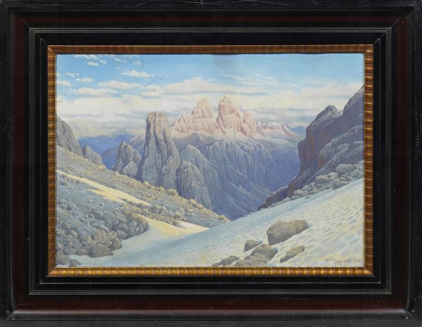 In Pastelltönen fast fotorealistische Darstellung der berühmten Drei Zinnen in den Sextner Dolomiten Südtirols. Südlich davon, durch ein tiefes Tal getrennt, die Cadinspitzen, die im Bild noch in das rötliche Licht der Abendsonne getaucht sind, während die Talzonen schon in das tiefe Blau der nahenden Dämmerung entschwinden. Im Vordergrund noch Reste eines Gletschers. Gouache auf Karton. R. u. sign.; Verso genaue Ortsangabe handschriftlich hinzugefügt. Ger. stockfleckig. 56,5 cm x 74,5 cm. Rahmen.