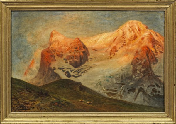 Impressionistische Landschaft mit seltenem Schweizer Alpenmotiv aus dem späten Oeuvre des vor allem als Orientmaler bekannten Künstlers. Eine geringfügig abweichende Version erschien auch als Kunstdruck im Verlag Richard Bong, Berlin. Öl/Lwd.; L. u. sign. u. dat. 1923. 50 cm x 75,5 cm. Rahmen.