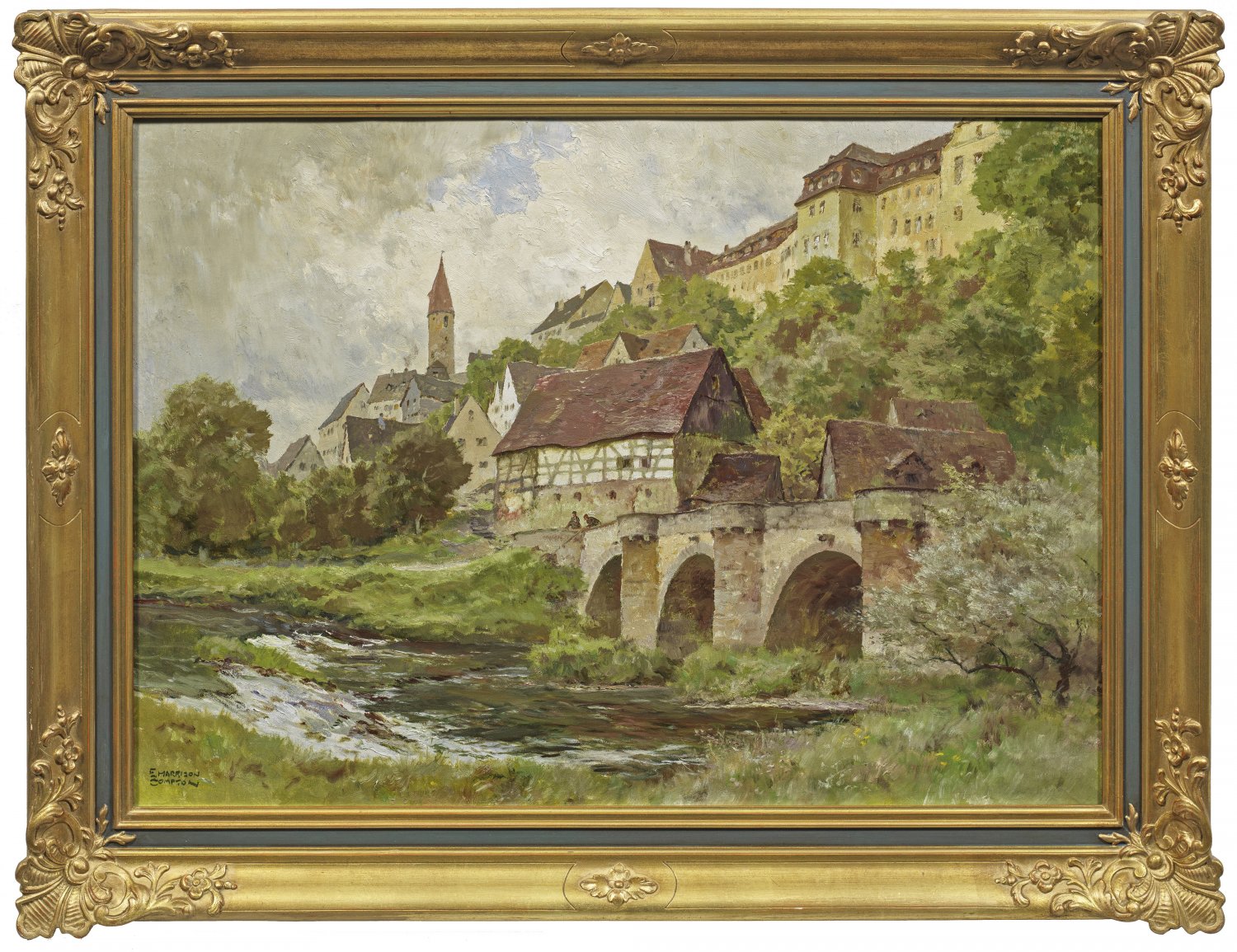 Blick vom Talgrund der Jagst über die fünfbogige Steinbrücke des 18. Jhs. hoch zum Schloss (ehemaliges Residenzschloss der Fürsten von Hohenlohe-Kirchberg) und die Stadt mit dem mittelalterlichen Stadtturm als Wahrzeichen. Das Gemälde dürfte in den 1940er Jahren im Atelier Comptons in Feldafing am Starnberger See entstanden sein, wohl auf der Basis eines Aquarells, das Compton bereits 1923 auf einer seiner Reisen durch Franken geschaffen hatte. Öl/Lwd.; L. u. sign.; 50,5 cm x 70,5 cm. Rahmen.