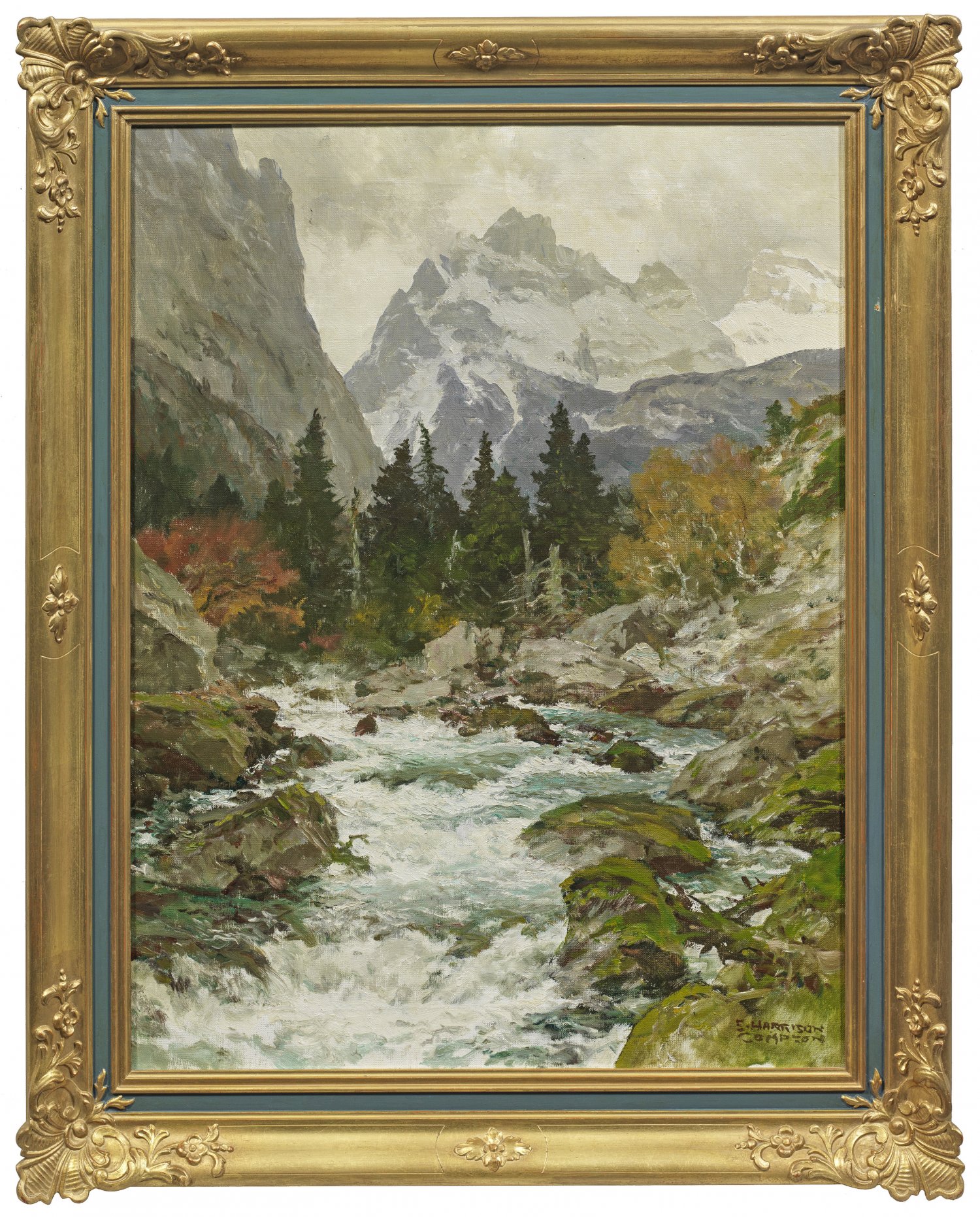Frühherbstlich gestimmter Blick vom felsigen Flusstal über Baumgruppen auf ein hoch aufragendes, teilw. schneebedecktes Bergmassiv. Compton wuchs in Feldafing am Starnberger See auf, wohin sein Vater, der englische Landschaftsmaler Edward Theodore Compton, bereits 1867 gezogen war und ihm die Begeisterung für Gebirgslandschaften und die Alpen weitergab. 1904 debütierte Compton bei der Großen Berliner Kunstausstellung und konnte danach reüssieren. Auf Bergtouren bereiste er weite Teile der Alpen, wo er eine Fülle von Zeichnungen und Aquarellen schuf, die ihm auch später als Basis für seine Gemälde dienten. Öl/Lwd.; R. u. sign.; 68 cm x 52 cm. Rahmen.
