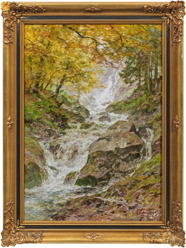 Blick auf einen felsigen, von Bäumen flankierten Gebirgsbach, wohl in den Voralpen. Durch teilw. pastos aufgetragene Höhungen fängt Compton bei diesem impressionistischen Gemälde virtuos die Lichtwirkungen des reißenden Wassers ein. Die Alpen und Süddeutschland waren Hauptsujets Comptons, deren Städte und Landschaften er zunächst in Zeichnungen und Aquarellen festhielt, um diese später in seinem Atelier in Feldafing oft in Gemälde umzusetzen. Öl/Lwd.; R. u. sign.; 70 cm x 50 cm. Rahmen.
