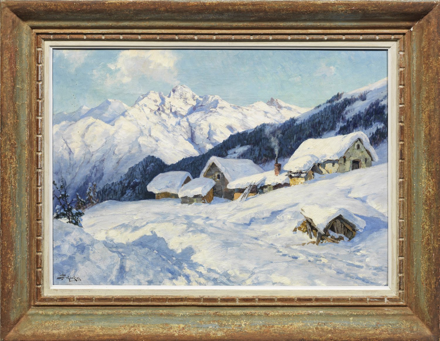 Impressionistische Winterlandschaft aus dem reifen Oeuvre Schenkers mit virtuoser Darstellung der bläulich-violetten Schneeflächen. Schenker studierte 1870-1876 in Düsseldorf und Weimar bei Albert Flamm und Theodor Hagen. 1896 erhielt er auf der Großen Berliner Kunstausstellung eine große Goldmedaille. Erst 1905 kehrte er in die Schweiz zurück. Öl/Lwd.; L. u sign.; 44 cm x 62 cm. Rahmen.