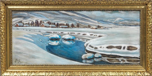 Blick auf eine weite, tiefverschneite Landschaft, durch die sich ein schmaler Fluss schlängelt, im Hintergrund ein lang gestrecktes Straßendorf mit kleinen Bauernhäusern. 1915 entstandenes, motiv- und stiltypisches, impressionistisches Werk des Künstlers, in dem für ihn charakteristischen, breiten, panoramaartigen Querformat. Der bedeutende polnische Maler studierte an der Krakauer und Münchener Akademie. Bei Fürst Anton von Radziwill in Nieswiez lernte er 1886 Kronprinz Wilhelm kennen, 1889 wurde er Hofmaler des Kaisers in Berlin. 1895 kehrte er nach Krakau zurück, wo er die Akademie reformierte. In seinen lichterfüllten Winterlandschaften, die zu den Schwer- und Höhepunkten seines Oeuvres zählen, nahm er die Stiltendenzen der französischen Impressionisten und Münchener Secession auf. Öl/Malkarton. L. u. sign. u. dat. 1915 mit Ortsangabe Bystra. 52 cm x 120 cm. Rahmen.