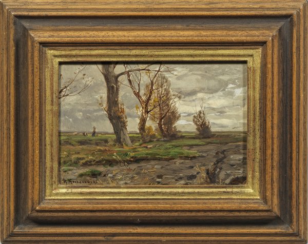 Motiv- und stiltypisches Werk Kochanowskis, einem der besten polnischen Landschaftsmaler seiner Generation und letztem Repräsentanten der polnischen Kunstszene in München. Er studierte an den Akademien in Krakau und Wien; 1888 lernte er auf einer Paris-Reise die Werke von Jean-Baptiste Corot und der Schule von Barbizon kennen, die sein weiteres Schaffen beeinflussten. Kochanowski stellte ab 1877 aus und wurde mehrfach ausgezeichnet; Werke befinden sich in den Museen in Krakau, Warschau und Posen. Öl/Holzafel. L. u. sign.; 16,5 cm x 24,5 cm. Rahmen.
