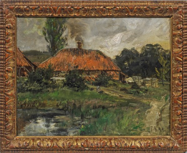 Brütt entwickelte ab 1876 in Düsseldorf einen eigenen Impressionismus, bei dem es ihm um die Erfassung des Gesamteindrucks ging. 1898-1920 gehörte er zur Kronberger Malerkolonie. Öl/Lwd.; R. u. monogr. u. dat. (18)94. Verso von fremder Hand betitelt "Am Weiher" u. bez. "v. F Brütt". 32,5 cm x 41,5 cm. Rahmen.